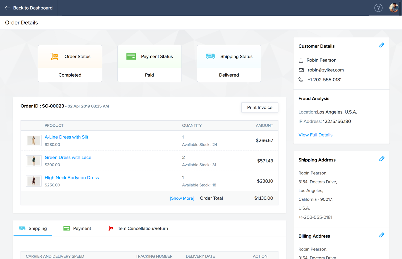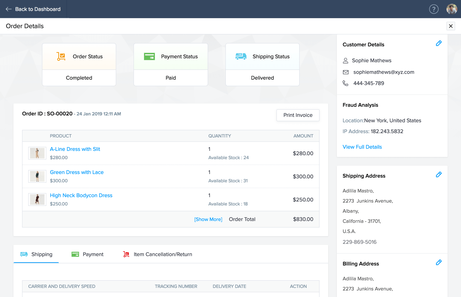 疑わしいアクティビティの自動追跡により、潜在的な詐欺を防ぎます。Zoho Commerceは、注文や決済における詐欺の可能性を判断するために必要な、極めて重要な情報を提供します。