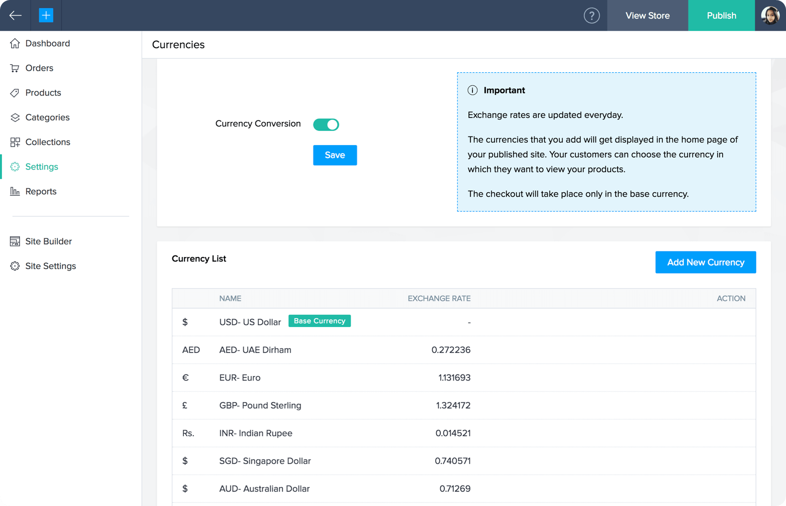 対応する通貨を選択すると、ストアでお客さま向けに通貨セレクターが表示されます。為替レートの変動は、変換後の通貨へ自動的に反映されます。