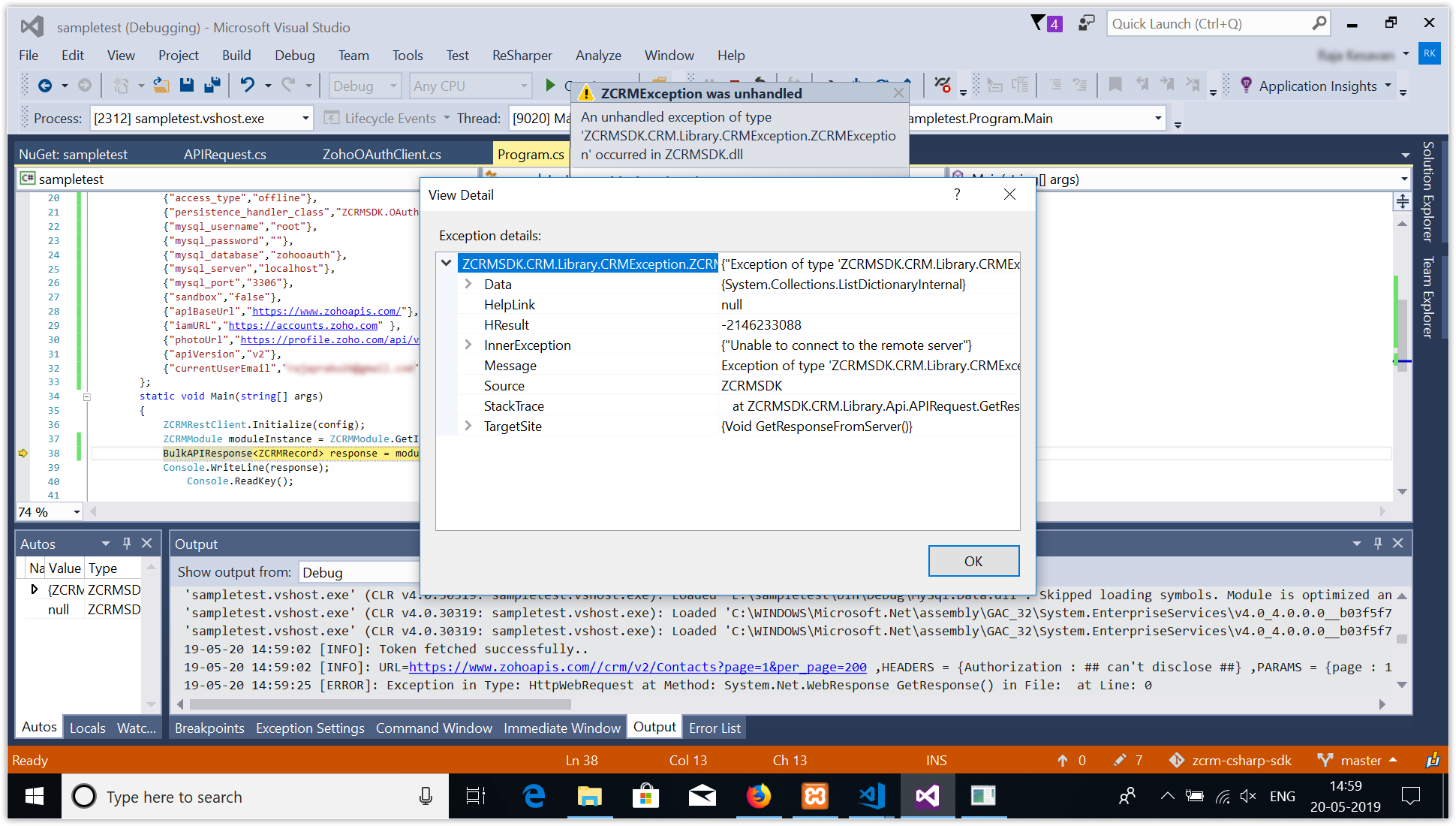 設定辞書の「apiBaseUrl」キーの値は、「https://www.zohoapis.com/」になっている必要があります。SDKによってスラッシュが行の末尾に自動的に追加されます。したがって、ユーザーもまたスラッシュを追加すると、SDKの最終的な入力値のスラッシュは2つになってしまいます。例:「https://www.zohoapis.com//」