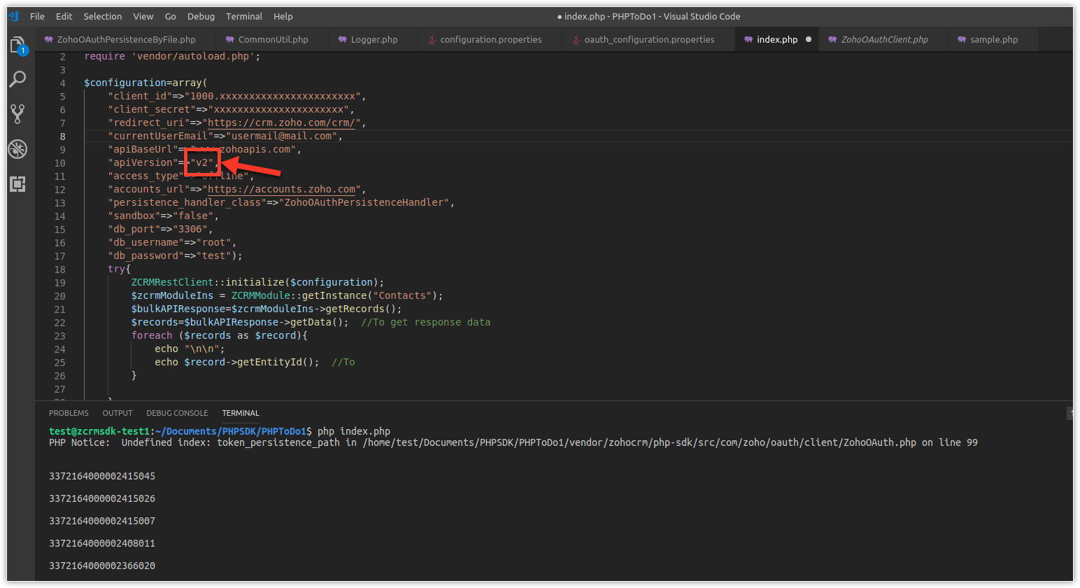 設定辞書の「apiBaseUrl」キーで、「https://www.zohoapis.com」の後ろにあるスラッシュ(/)を削除します。