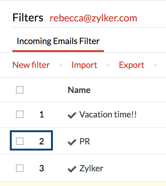 特定のアカウントのために作成した一連のフィルターと同じものを、他のPOPアカウントで使用したい場合があります。このような場合は、Zoho Mailのフィルターのエクスポート/インポートオプションを使用して、他のアカウントに対しても同じ条件と処理の設定を再作成できます。