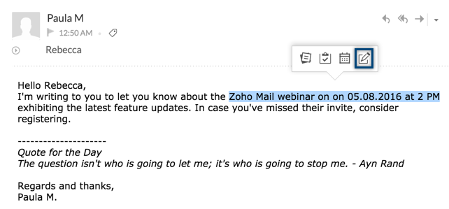 Zoho Mailでは、メールに対応するメモを追加できます。追加したいその他の情報とともに、メール全体をメモとして追加できます。