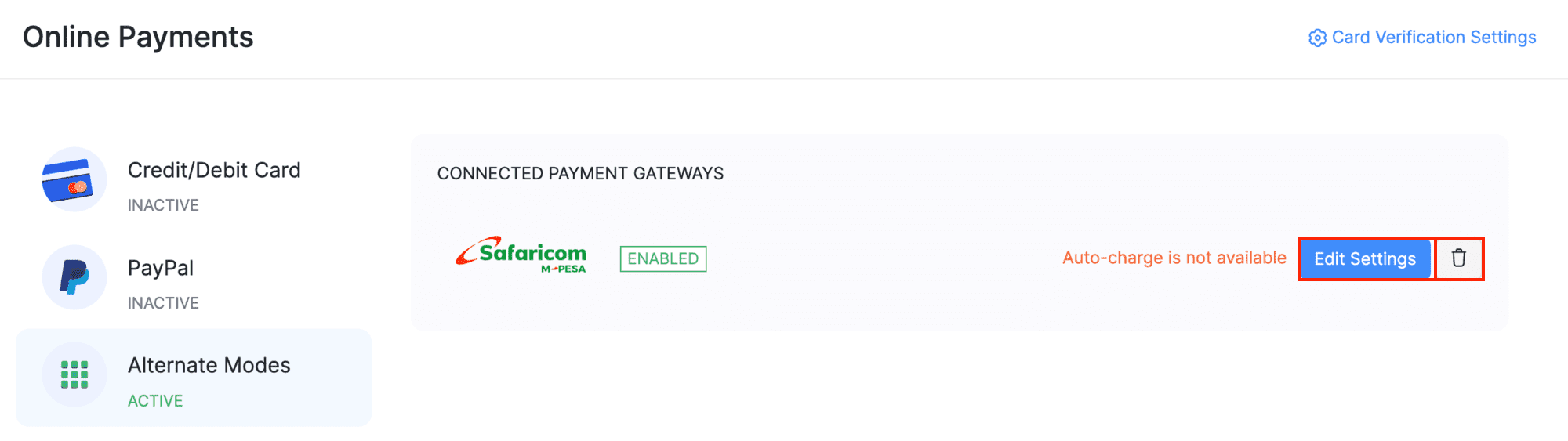 - Go to the Alternate Modes section and click the Delete icon next to Safaricom M-PESA.