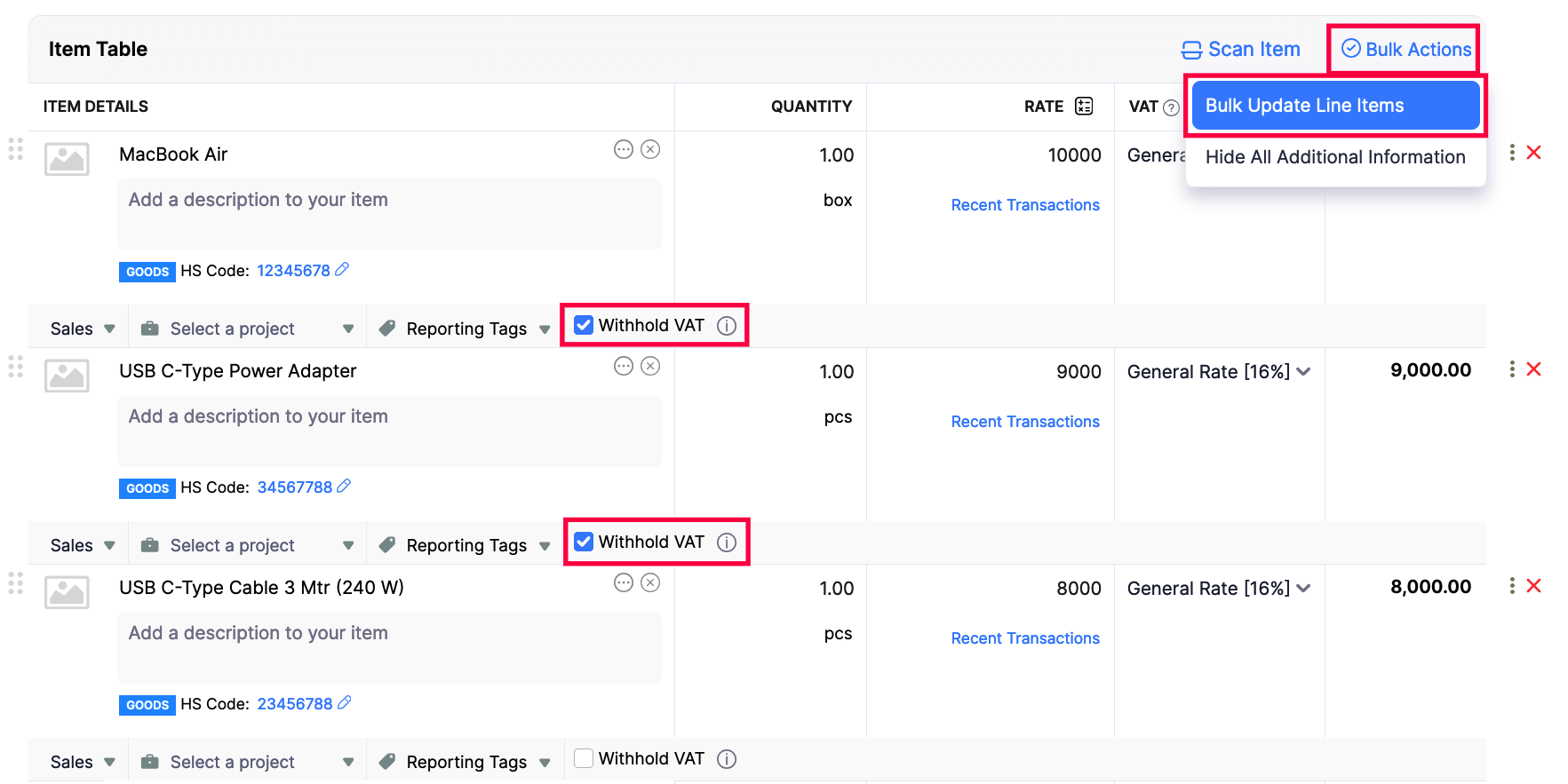 - To apply withholding VAT only for specific line items, click Bulk Actions next to the Item Table and select Bulk Update Line Items. Check Withhold VAT below the relevant items.