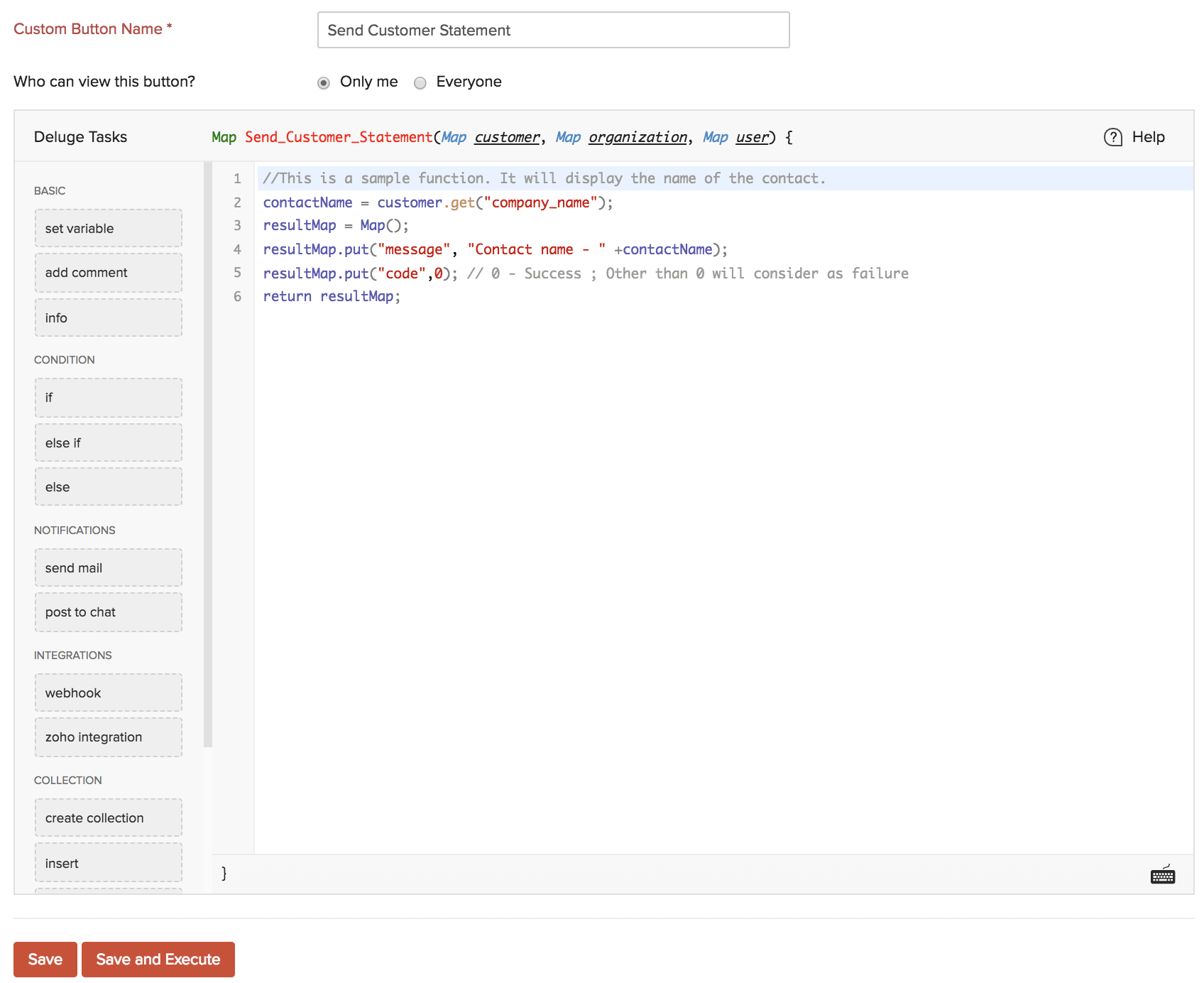 In Zoho Inventory, you can create additional buttons within a module to perform customized actions. You can create these buttons by writing a Deluge script for the functions you want them to execute.