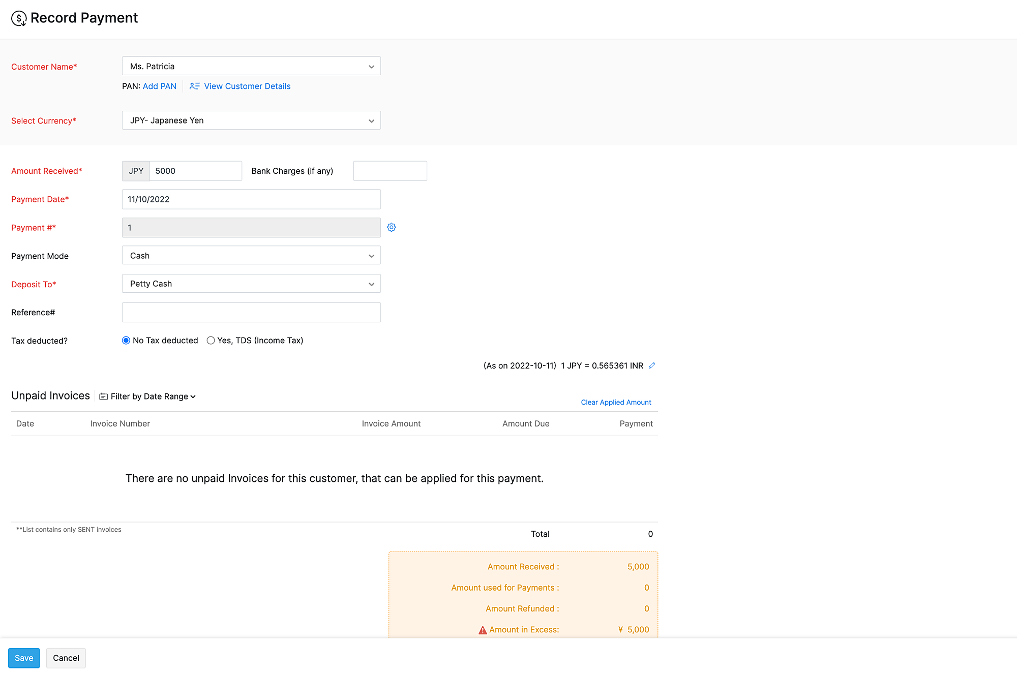- Click the currency dropdown next to Customer Name and select the currency in which you want to create the transaction.
