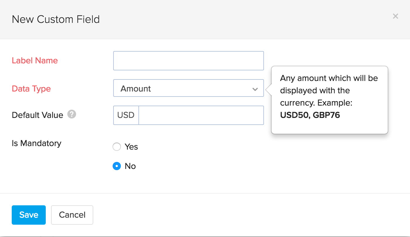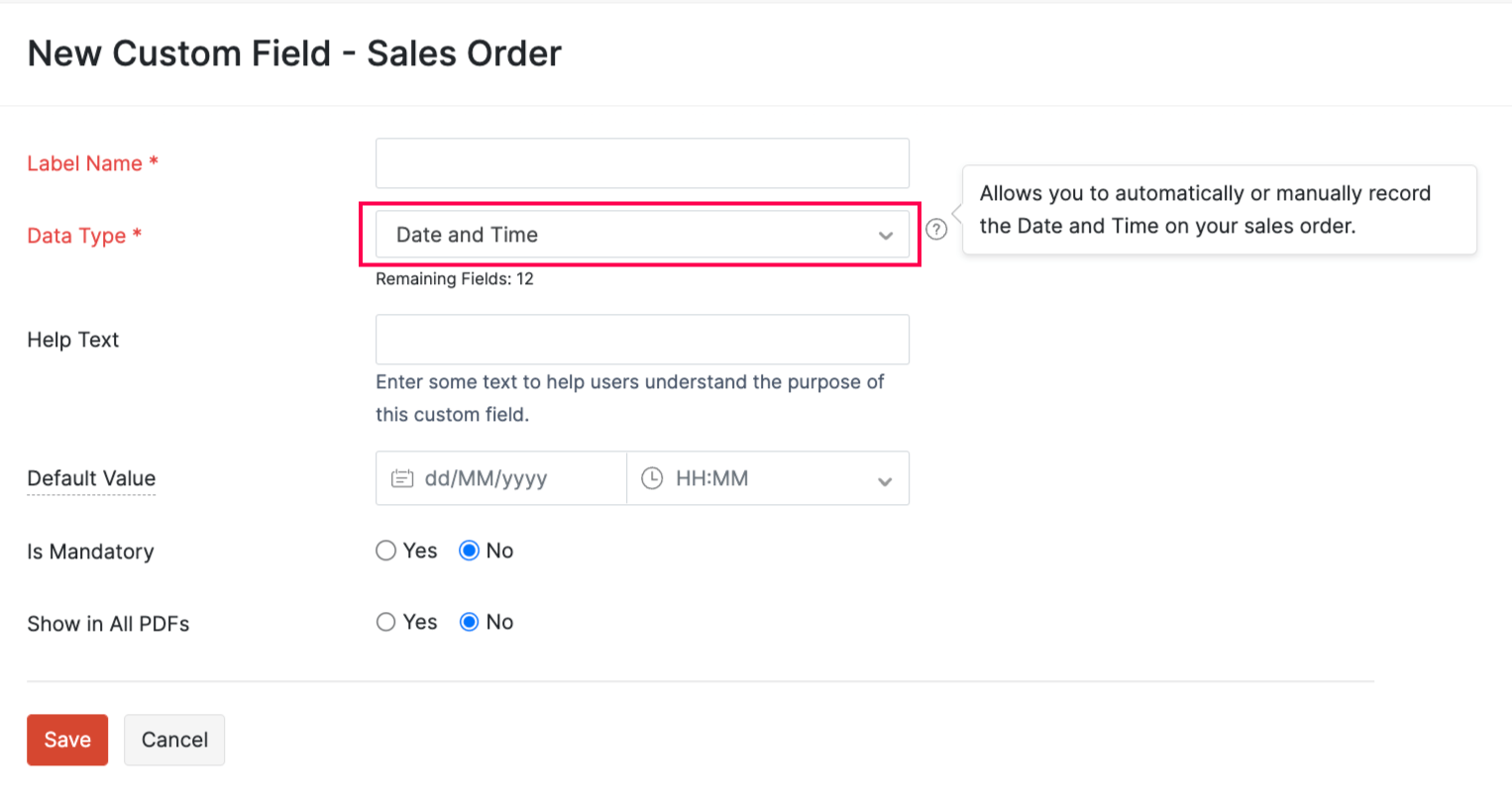 Note: Sum of the custom fields created for the above mentioned datatypes should not exceed 4.