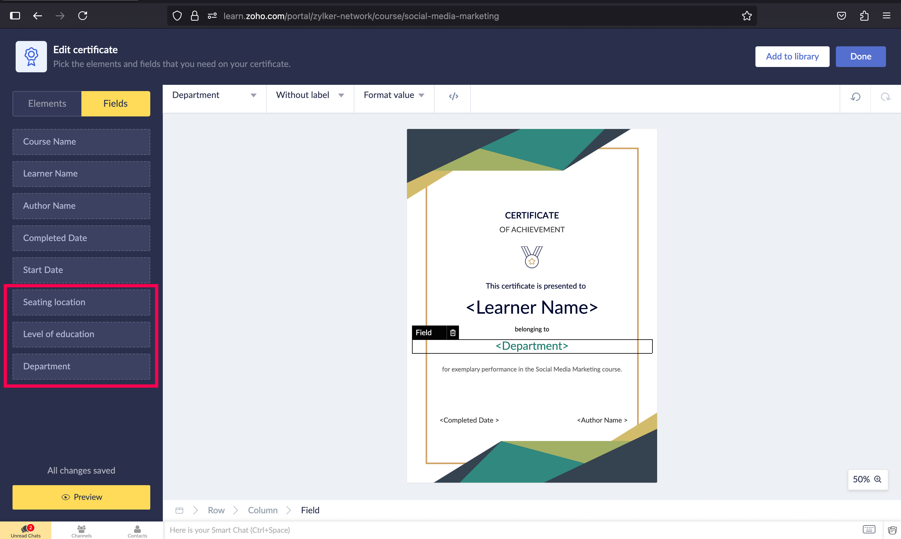 EnhancementsFeaturesProvide the complete details of your learners and enrich your certificates by adding custom user fields within the certificates.