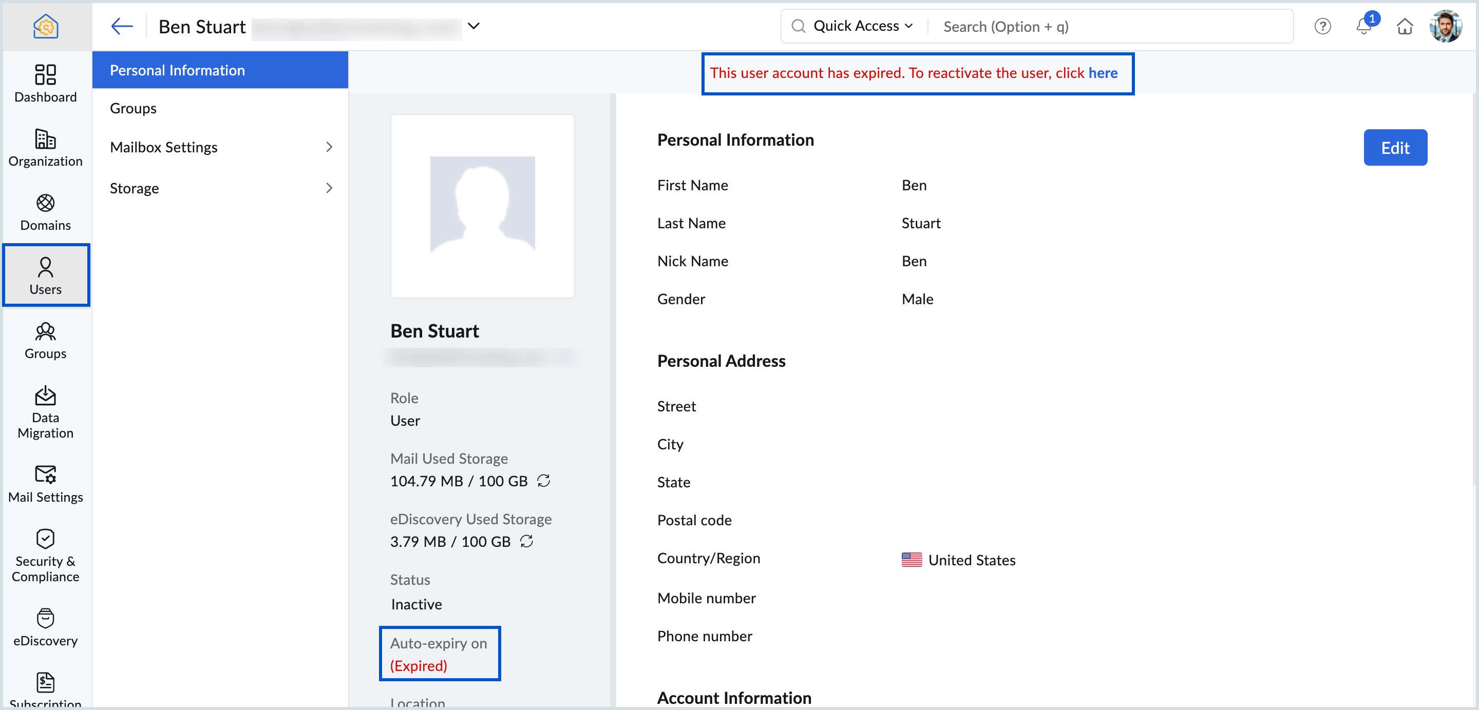 When a user account has been deactivated or marked as inactive, it must be reactivated for the user to regain access to their account. Once reactivated, users can resume their normal activities within their mailbox and access other Zoho applications (such as CRM, Projects, and Invoice). To reactivate a user account, follow these steps: