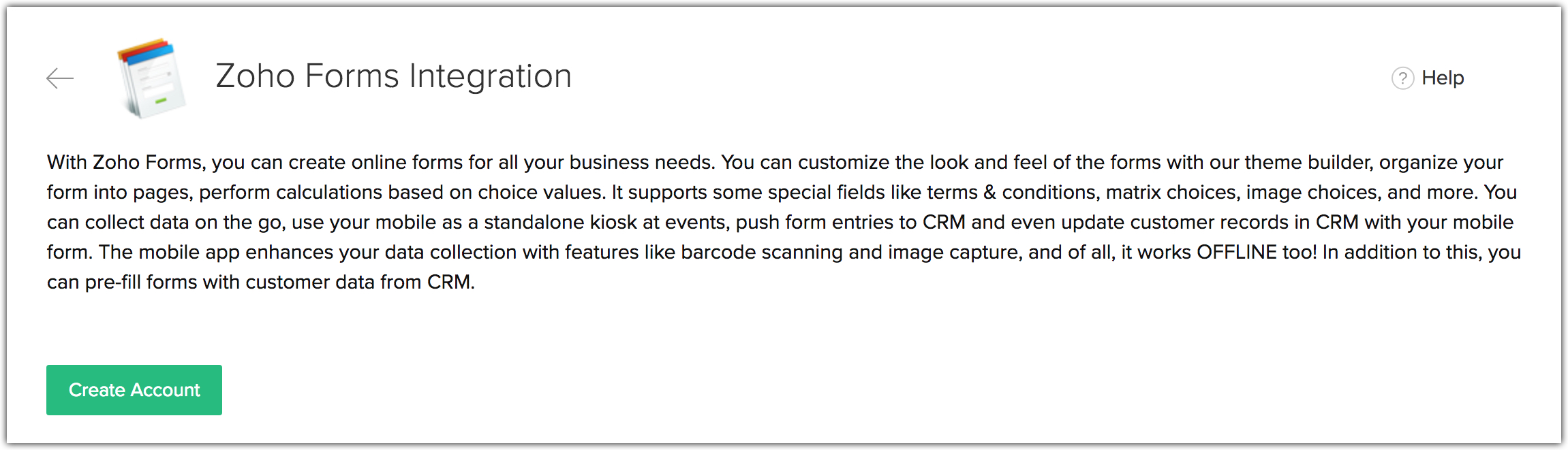 - Klik op de pagina Zoho Forms Integration op Create Account. Deze optie wordt weergegeven als u geen account hebt in Zoho Forms.