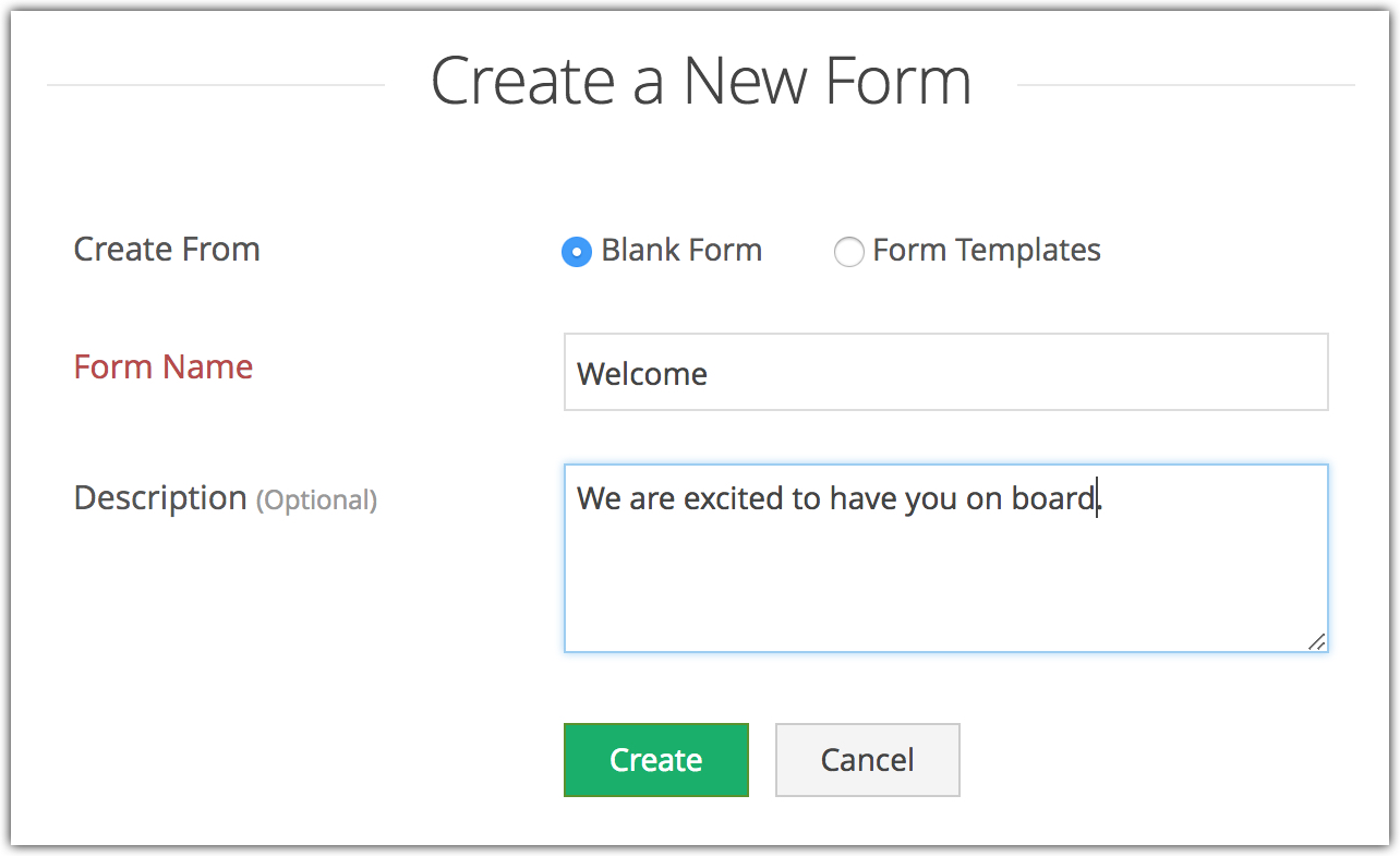 Met Zoho Forms kunt u een geheel nieuw formulier maken of een keuze maken uit de beschikbare sjablonen. Ga naar https://forms.zoho.com en begin met het samenstellen van uw formulier. Zie ook:Een formulier maken.