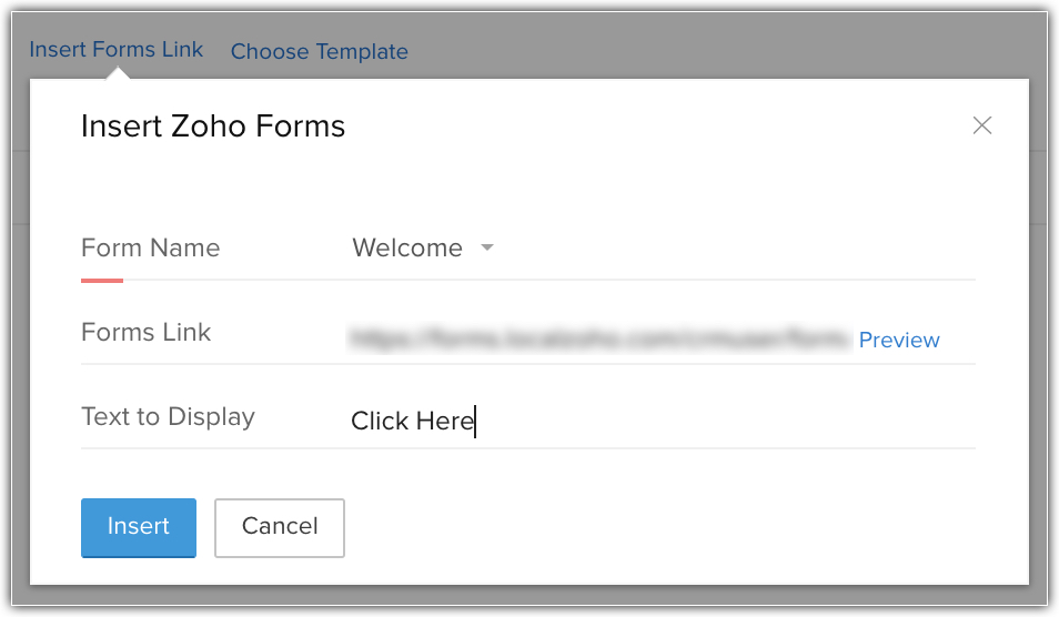 - Ga als volgt te werk in het pop-upvenster Insert Zoho Forms: