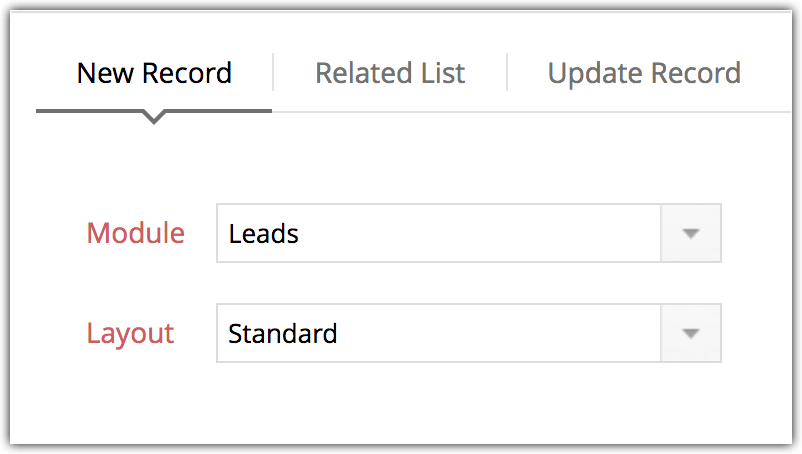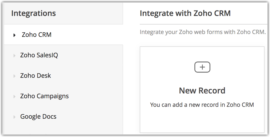 - Ga naar het tabblad Integrations > Zoho CRM > + New Record.