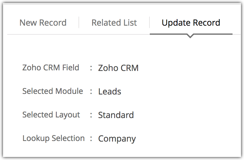- Ga naar het tabblad Integrations > Zoho CRM > Update Record.