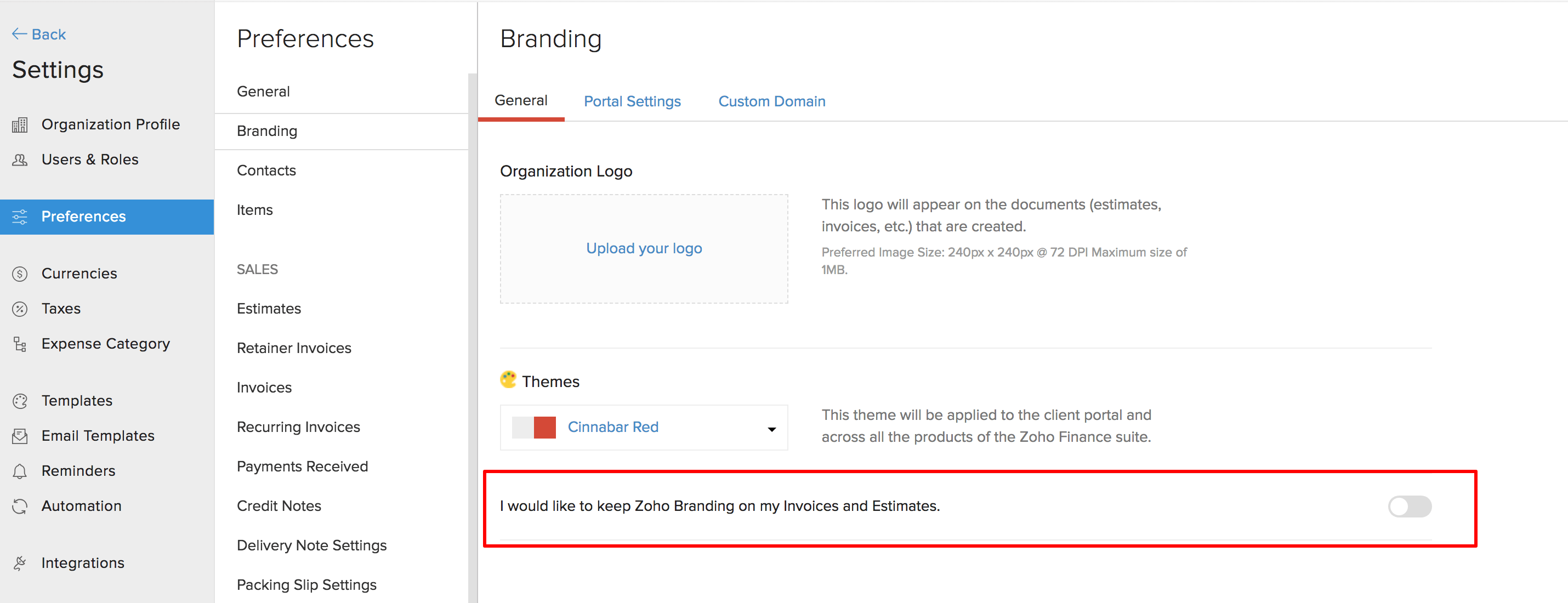 - Under the General tab, disable I would like to keep Zoho Branding on my Invoices and Estimates.
