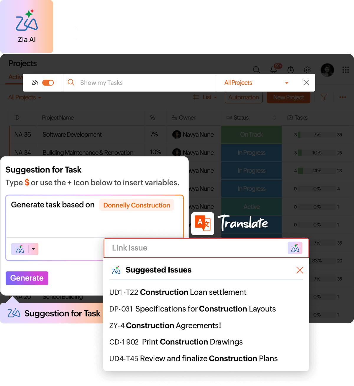 - Plan faster and save time with intuitive suggestions. Based on the project details, Zia can create suitable task names or link related issues to tasks.
