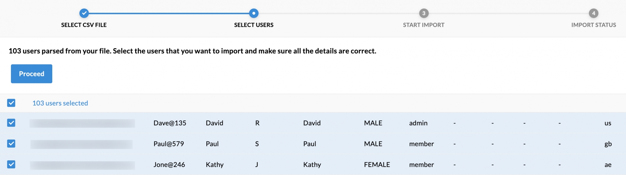 - Depois que todos os valores forem atualizados, selecione os usuários a serem importados e clique em Prosseguir.