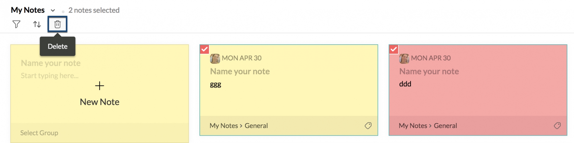 Você pode excluir várias notas de uma só vez a partir do Modo de visualização de notas para mantê-las organizadas. Selecione a(s) nota(s) a ser(em) excluída(s) e clique no ícone Delete, no menu do cabeçalho.