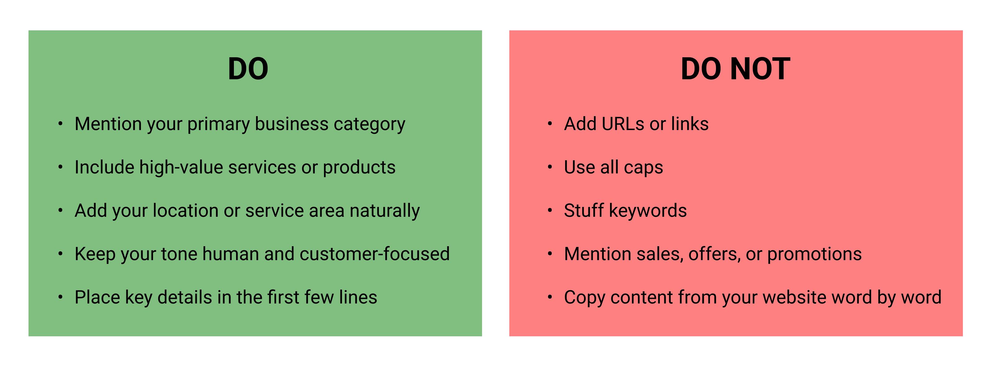 Open naturally with your business name, primary category, and core service. (No keyword stuffing.)