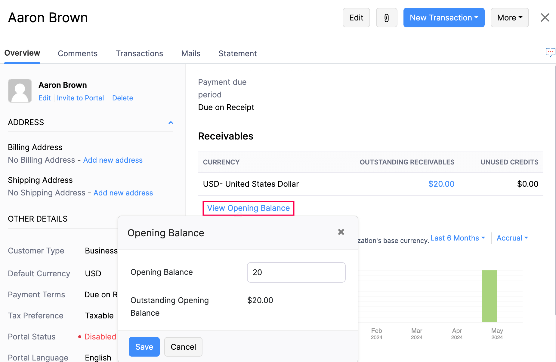 - Enter the new opening balance and click Save.