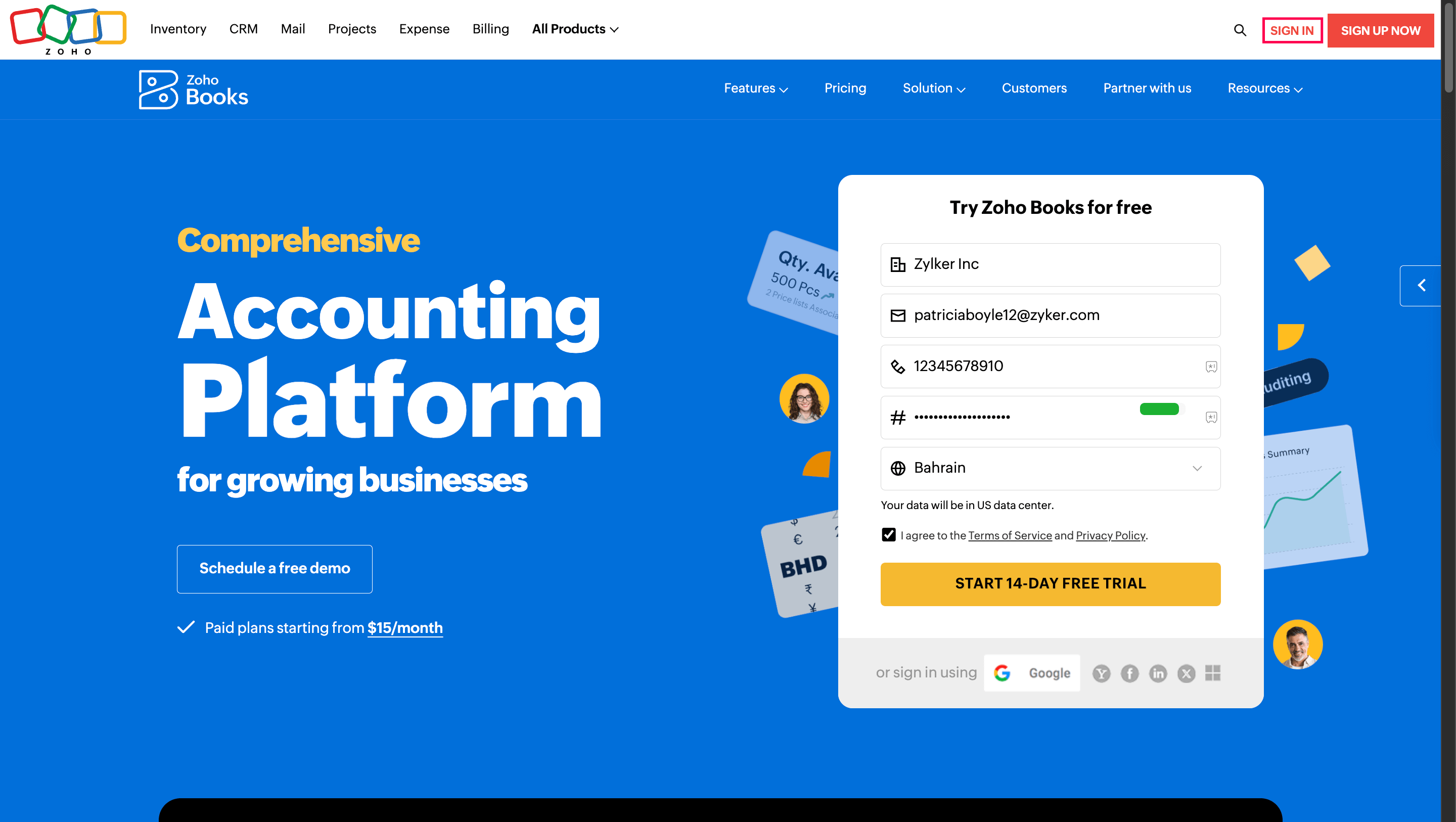 Insight: You can also sign up for Zoho Books using your Google, Office 365, LinkedIn, X (formerly Twitter), or Facebook account.