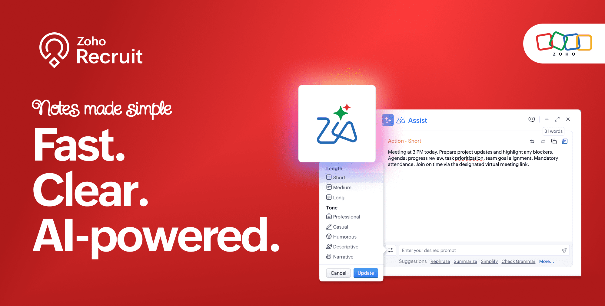 EnhancementsZia can now help you write clear, professional notes in seconds. Add your points, hit AI Assist, and get crisp updates instantly, with faster response times across Recruit.