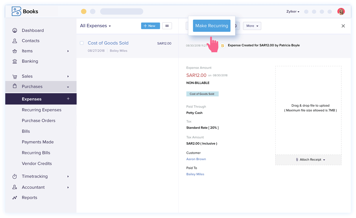 Generate recurring profiles for expenses that regularly occur and automatically record them in Zoho Books.