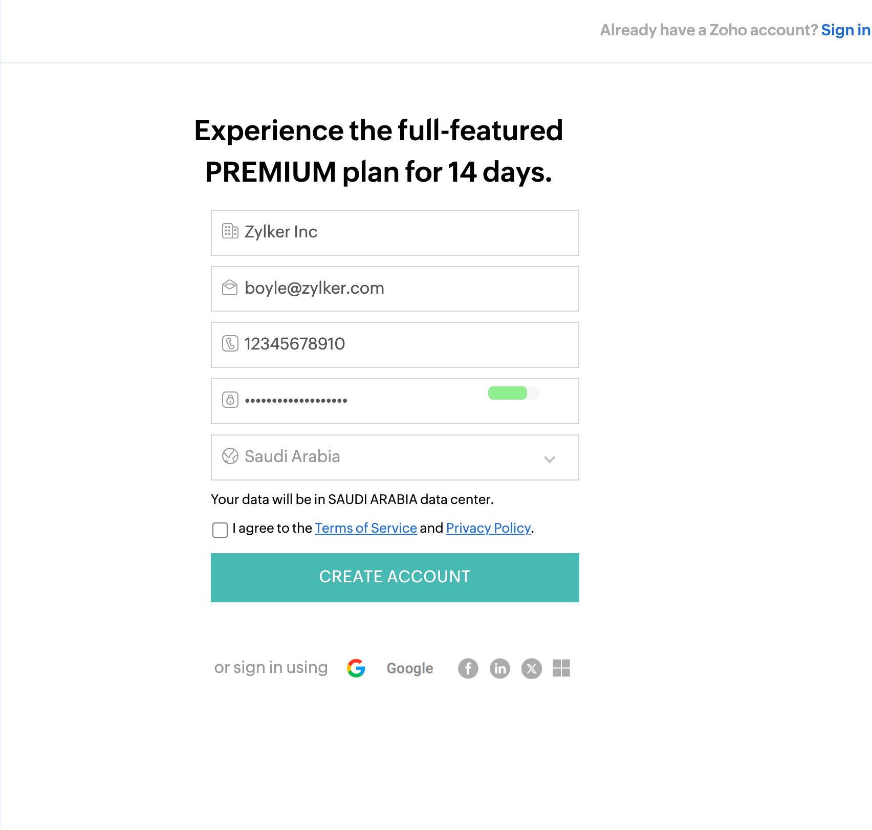 Insight: You can also sign up for Zoho Books using your Google, Office 365, LinkedIn, X (formerly Twitter), or Facebook account.