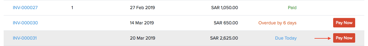 - Select the invoice for which you wish to receive the payment (and for which you have selected PayTabs as a payment option).