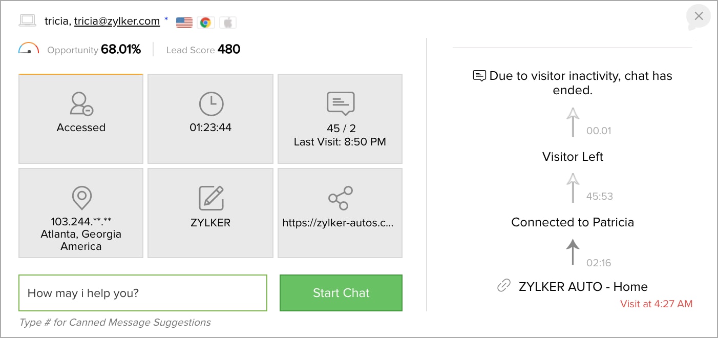 To view the CRM details inside the operator chat window, it is necessary to integrate SalesIQ with Zoho CRM. It is also necessary to have the customers' details stored inside your CRM account previously.
