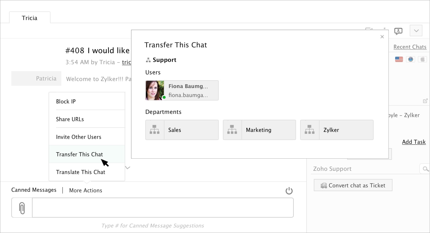 You can transfer a chat to another operator by navigating to the operator chat window and then click on More Actions > Transfer This Chat.