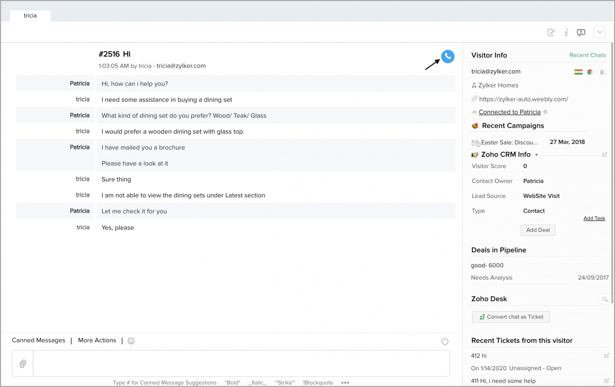 Audio calls can be initiated by navigating to the operator chat window, and clicking on the symbol near the Visitor Info section. It is necessary to know that you can avail this feature only if the administrator has enabled it for you.