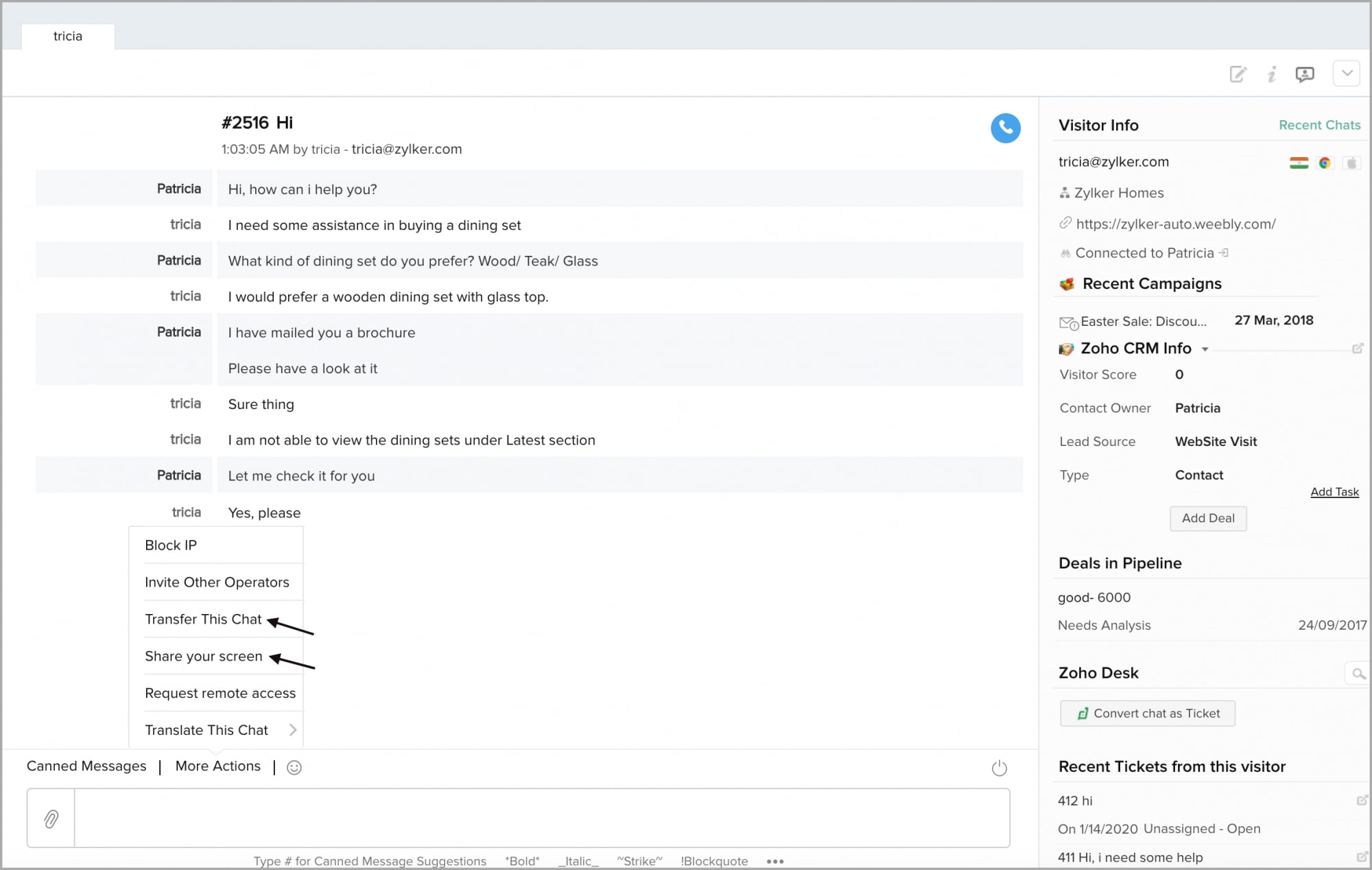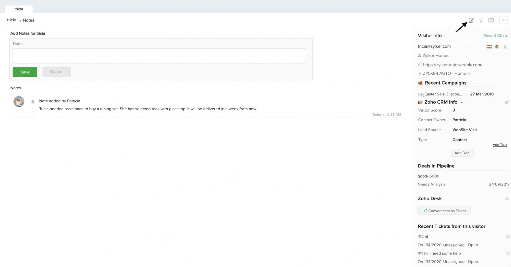 Yes, Notes feature helps us leave important notes about the visitor, his deals and requirements. These information left by previous operators will help the upcoming operators handle issues with ease without going through all the chat transcripts. You can add notes in the Visitor History, Connected, Chat History and Missed tab.