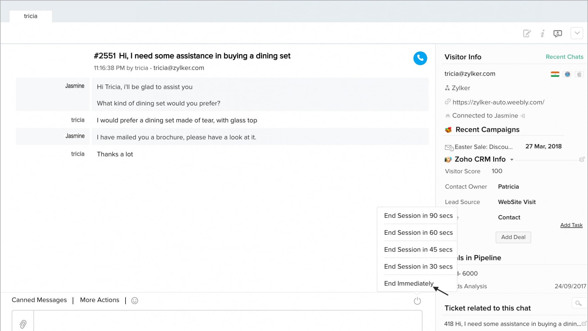 You can end a visitor chat by clicking on the End session icon in the chat window and then End Immediate or select any of your required End timer to End the current chat in the operator chat window.