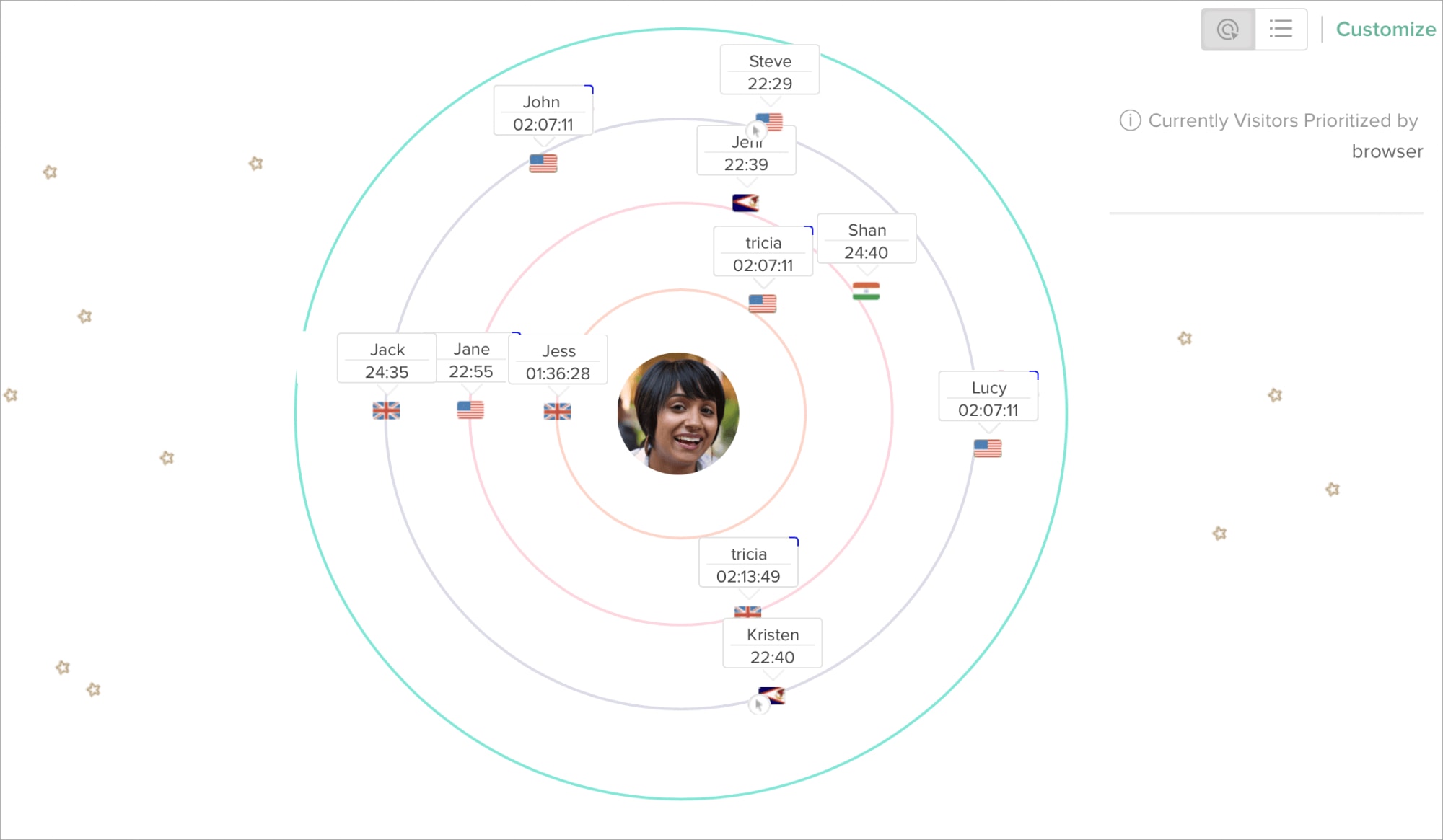 The visitors who match the criteria set by you in the Customize section are Hot visitors and shown within the priority rings. The visitors who do not match the criteria set by you in the Customize section are Cold visitors and are shown as stars outside the priority rings.