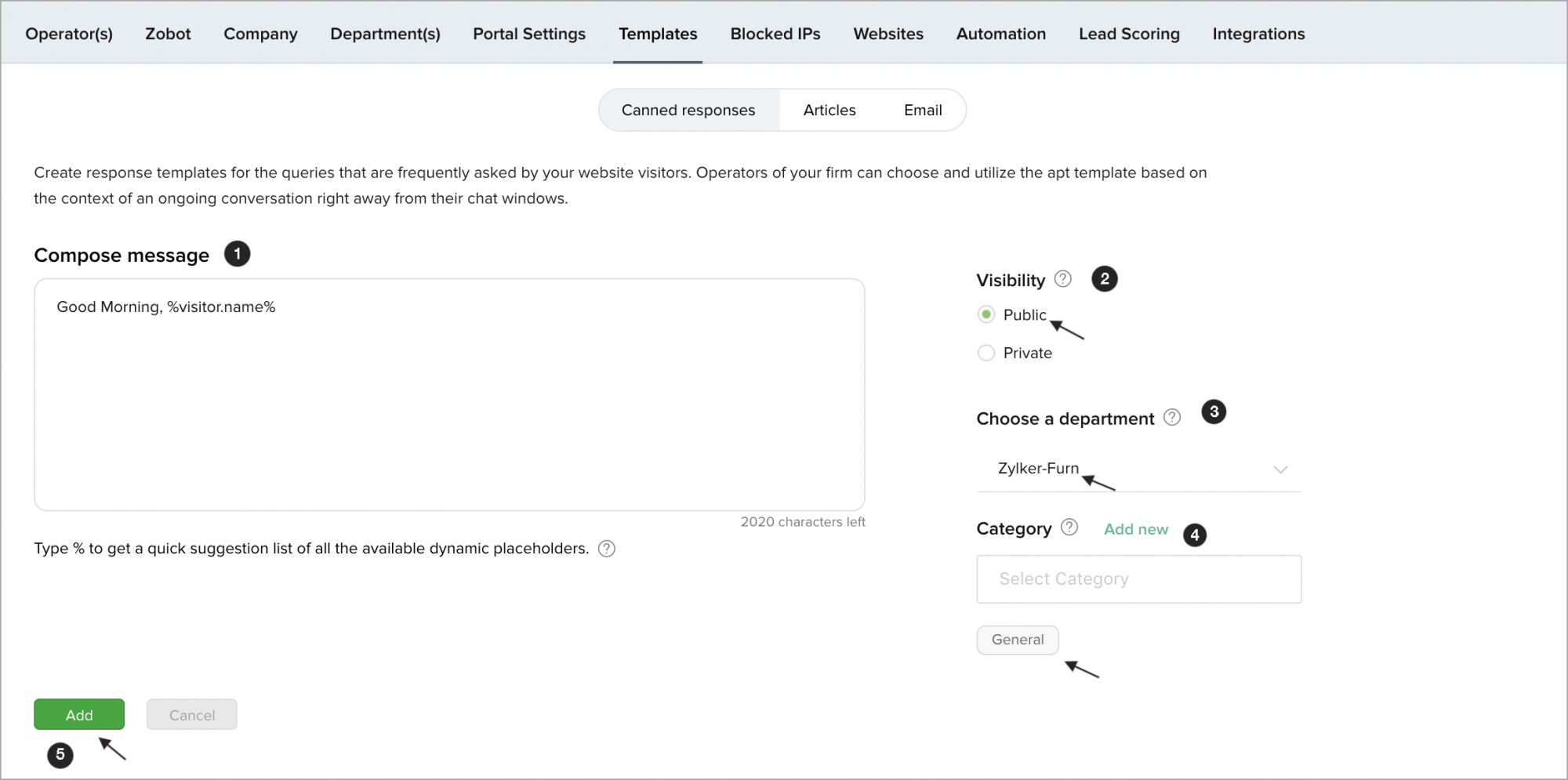 - Choose whether the canned response will be private or public.