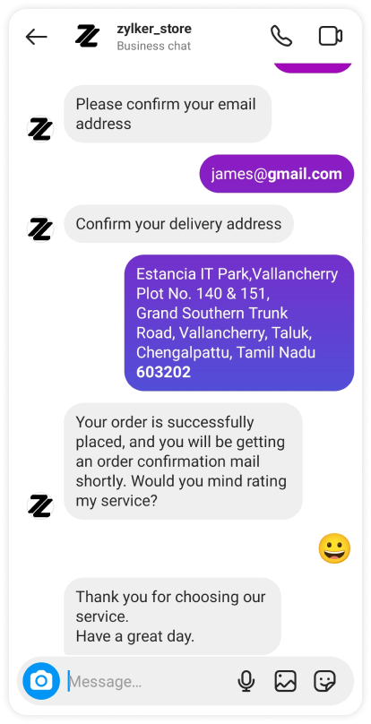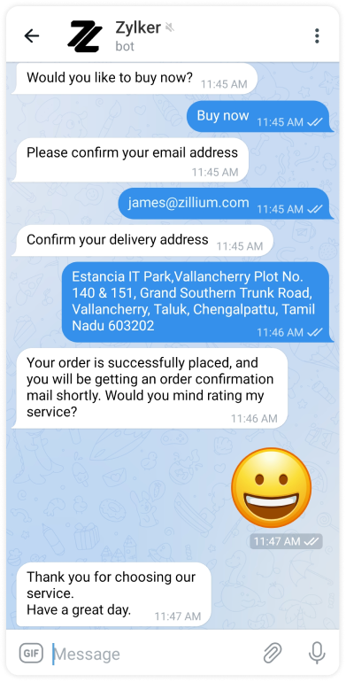 { "action": "end", "replies": ["Thank you for choosing our services", "Have a good day"] }