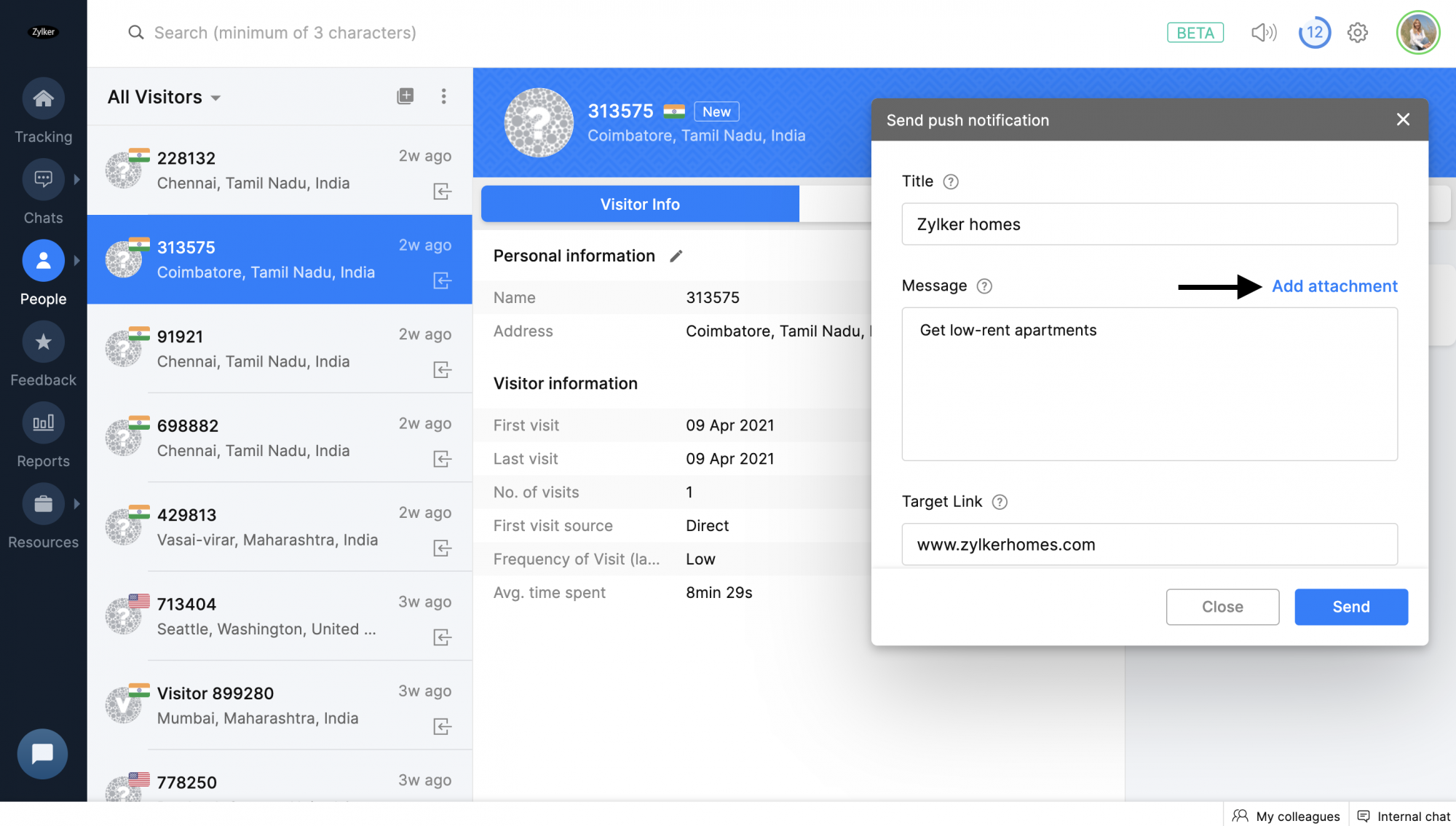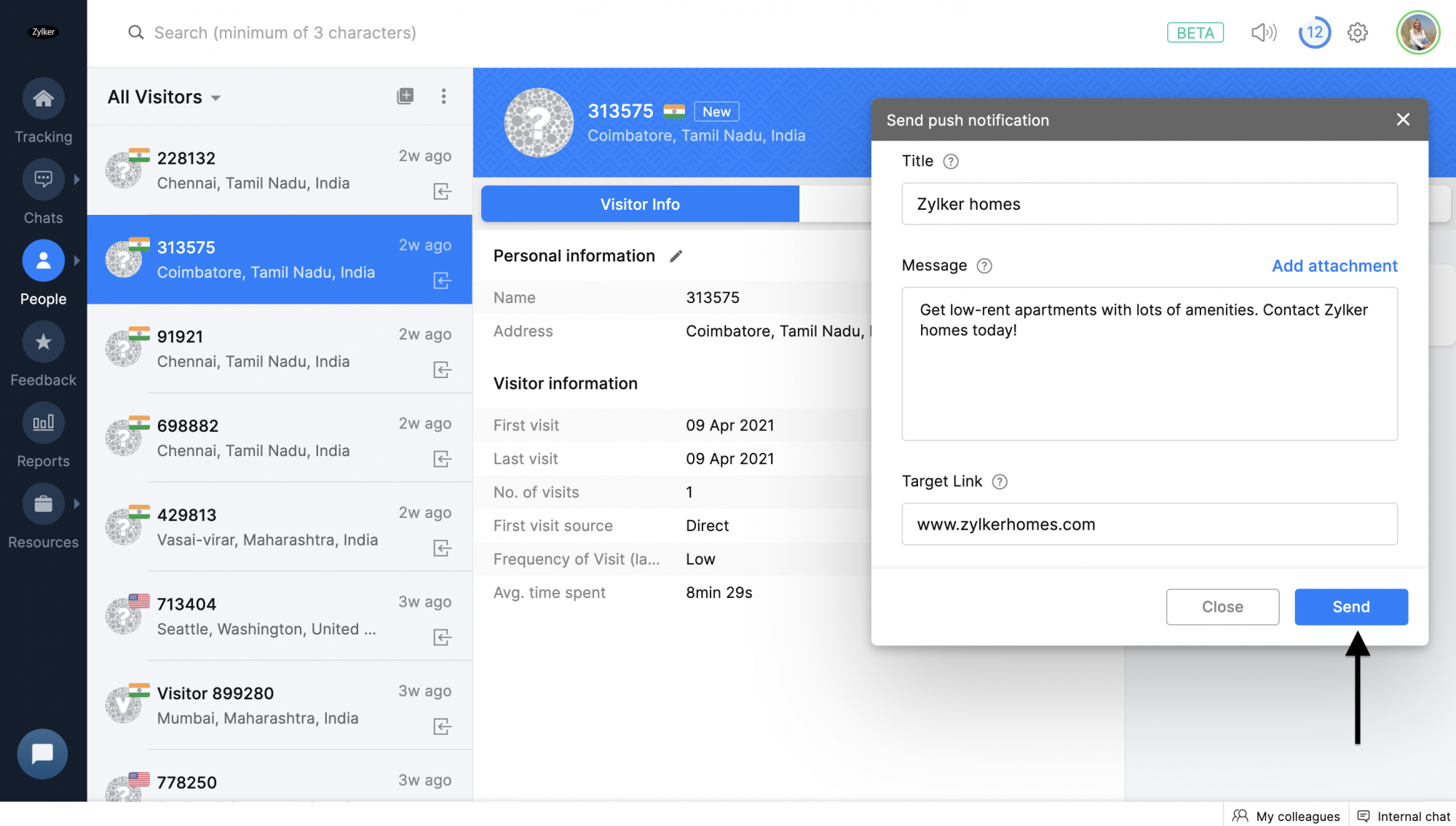 - In the SalesIQ portal, we have the option to send push notifications for visitors from Visitor History. You can test it by navigating to People > Visitors, click on the mobile icon.