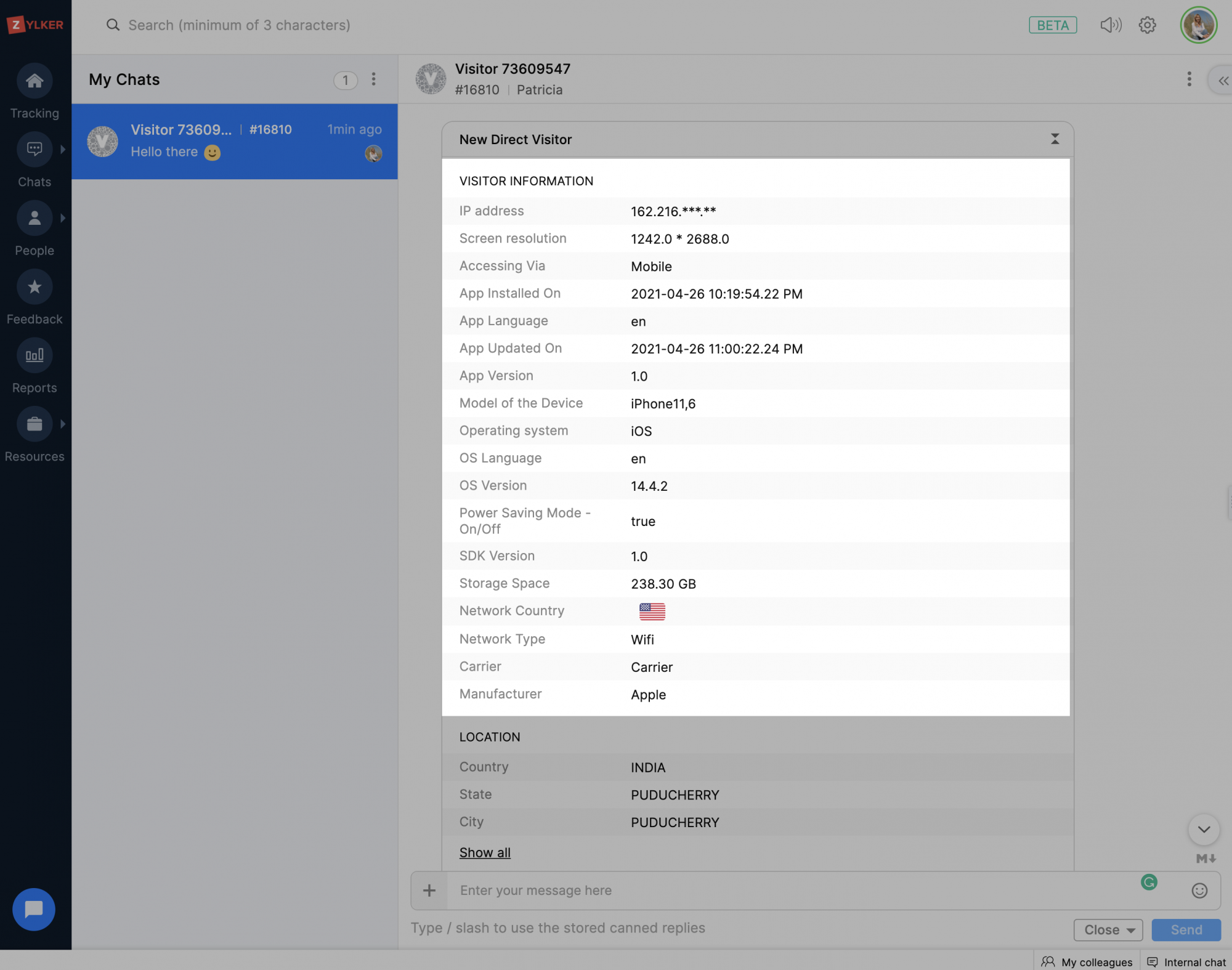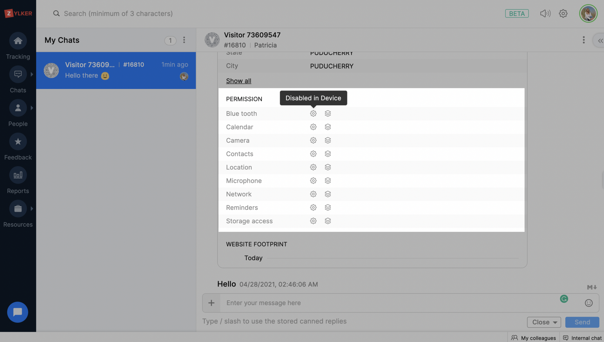 In the proactive window of the Visitor Online section, you can find the device used by the visitor to access your website as in mobile, laptop, etc. In this case, a mobile app symbol will be shown indicating that the visitor is from a mobile app. Permission Overview