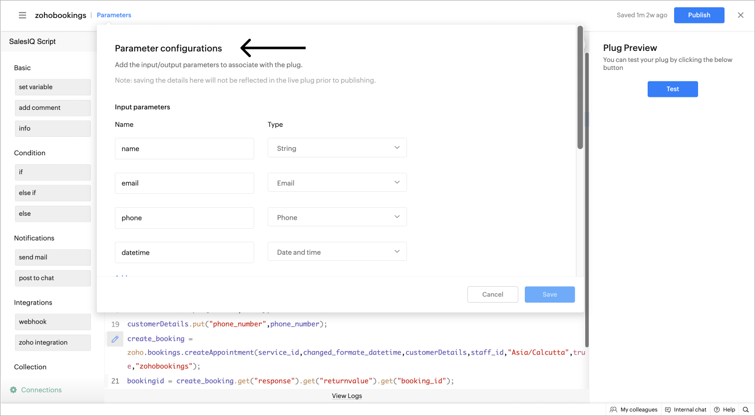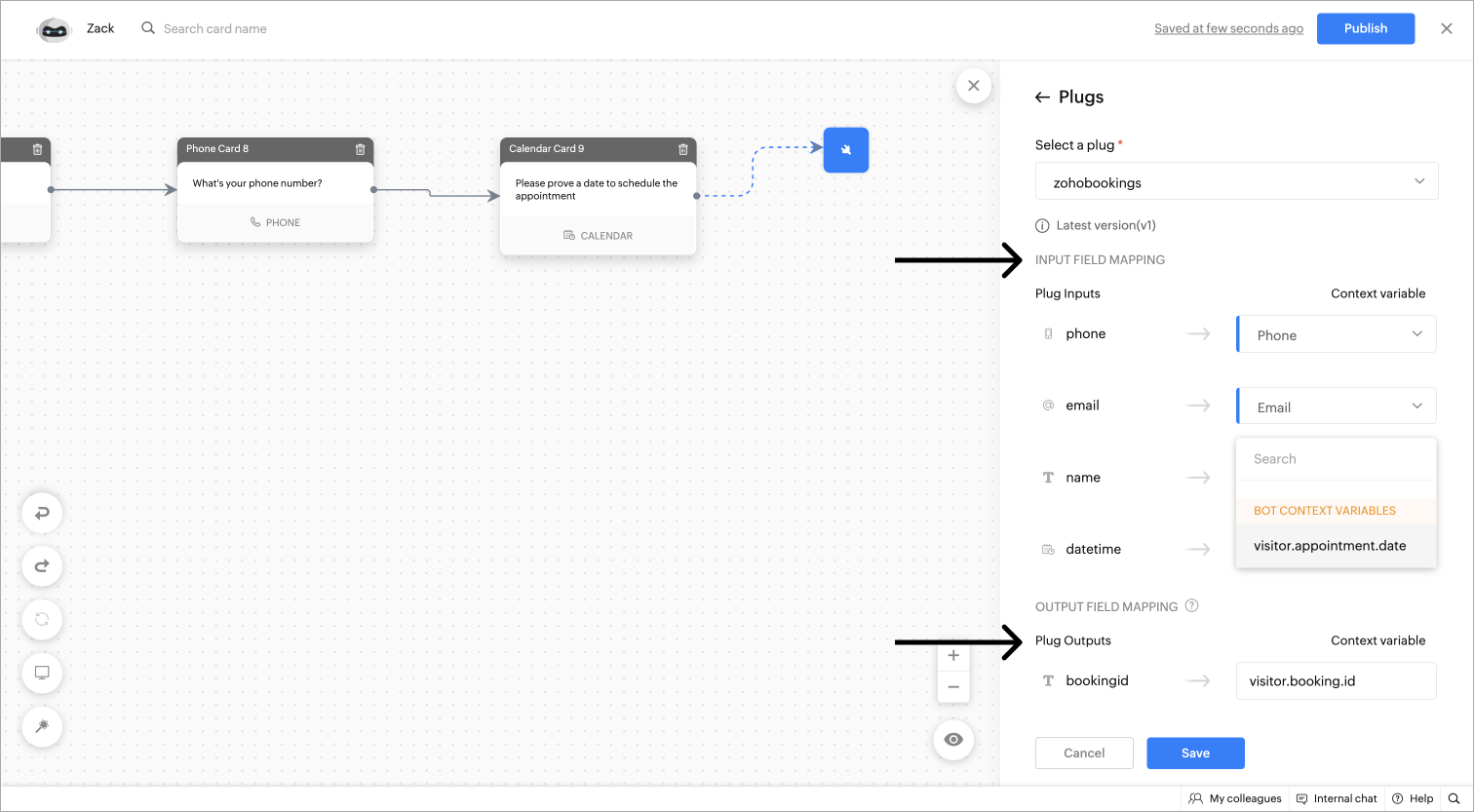 - In this example, to schedule an appointment in Zoho bookings, we need the visitors' names, email, phone, and date & time as the plug input.
