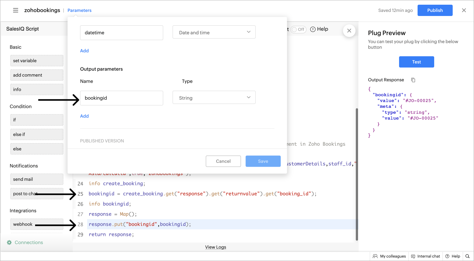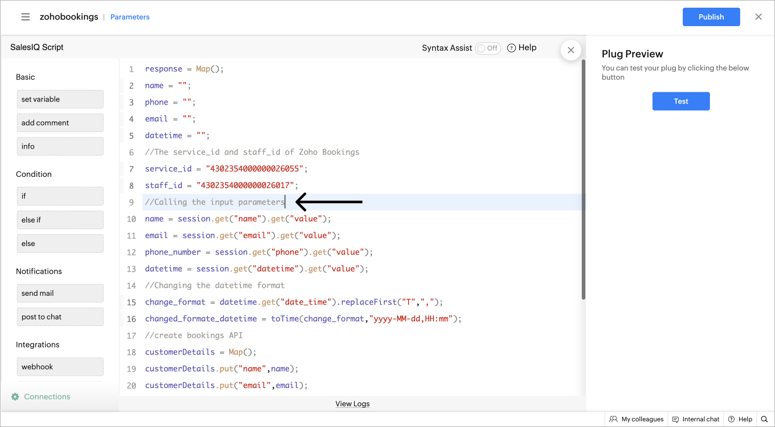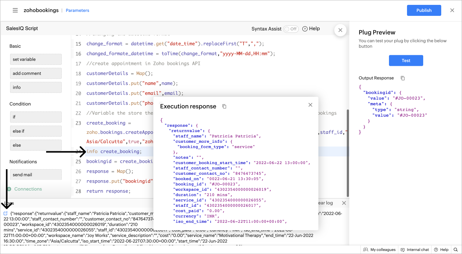 - Then write the logic for the plug to execute. In this example, give the JSON response for scheduling an appointment in Zoho Bookings.
