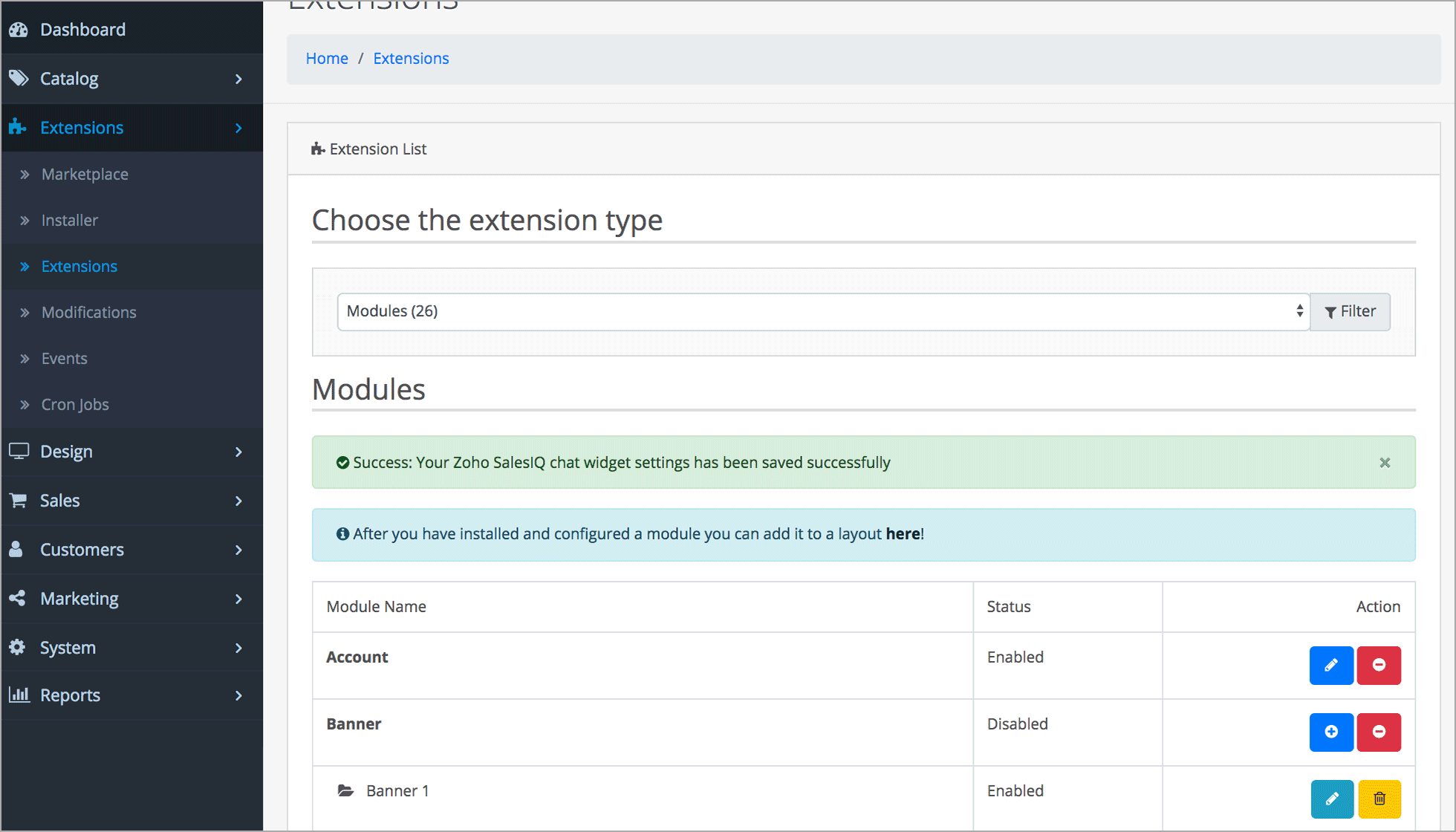 - Now, click on the Save button. The Zoho SalesIQ is now installed in your OpenCart.