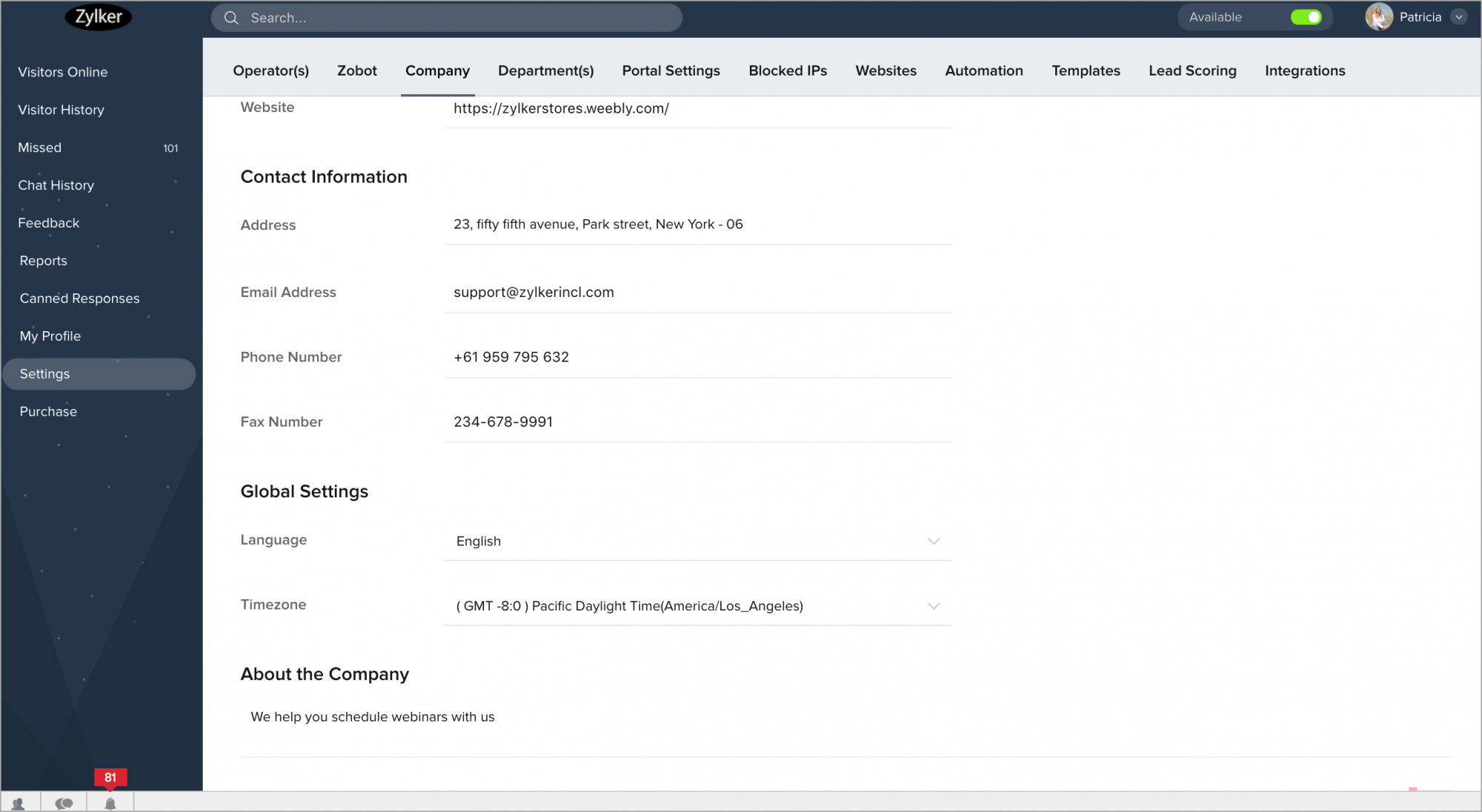 - On this same page, you can also choose your Zoho SalesIQ’s default language, Time Zone, and add an About the Company description.