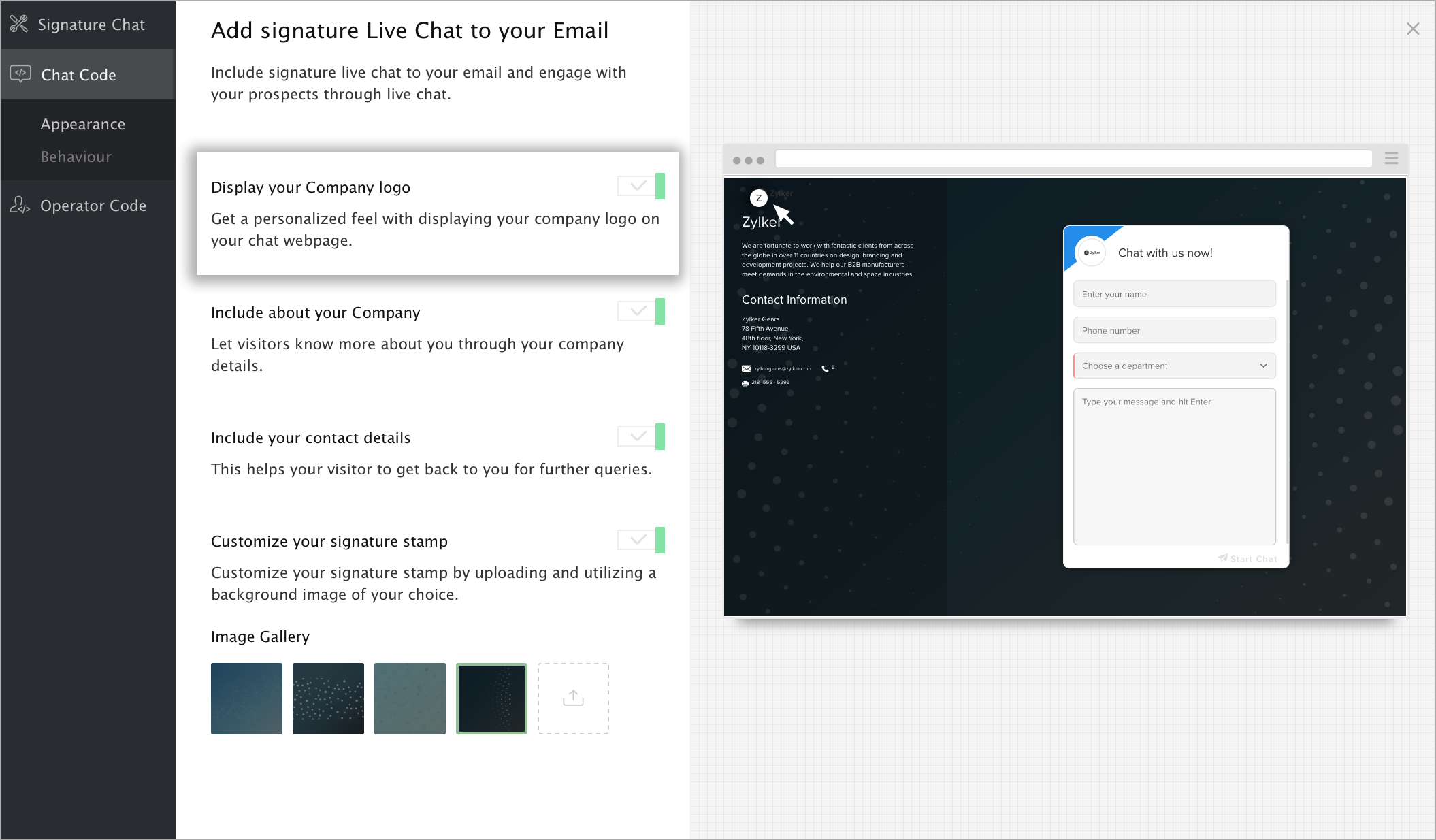 How do I include the company logo in the signature chat landing page?