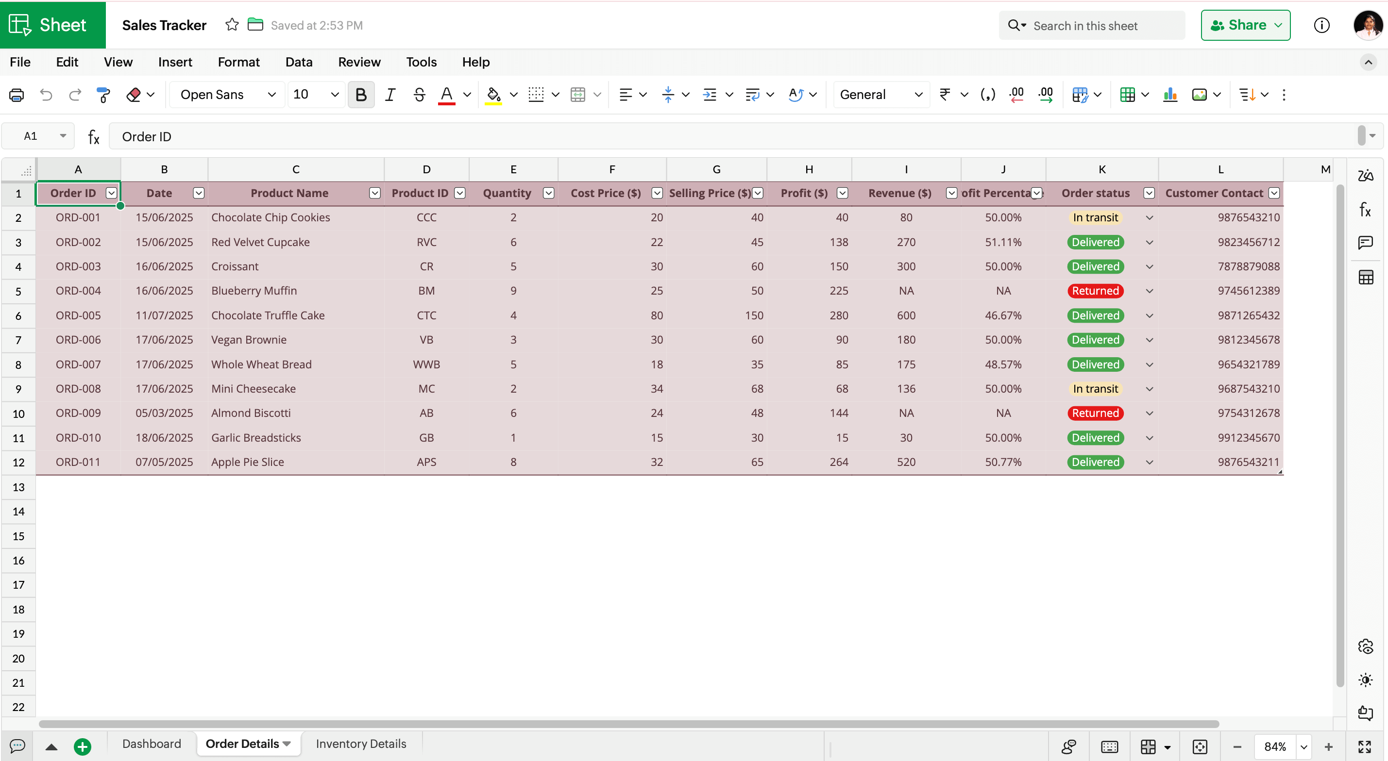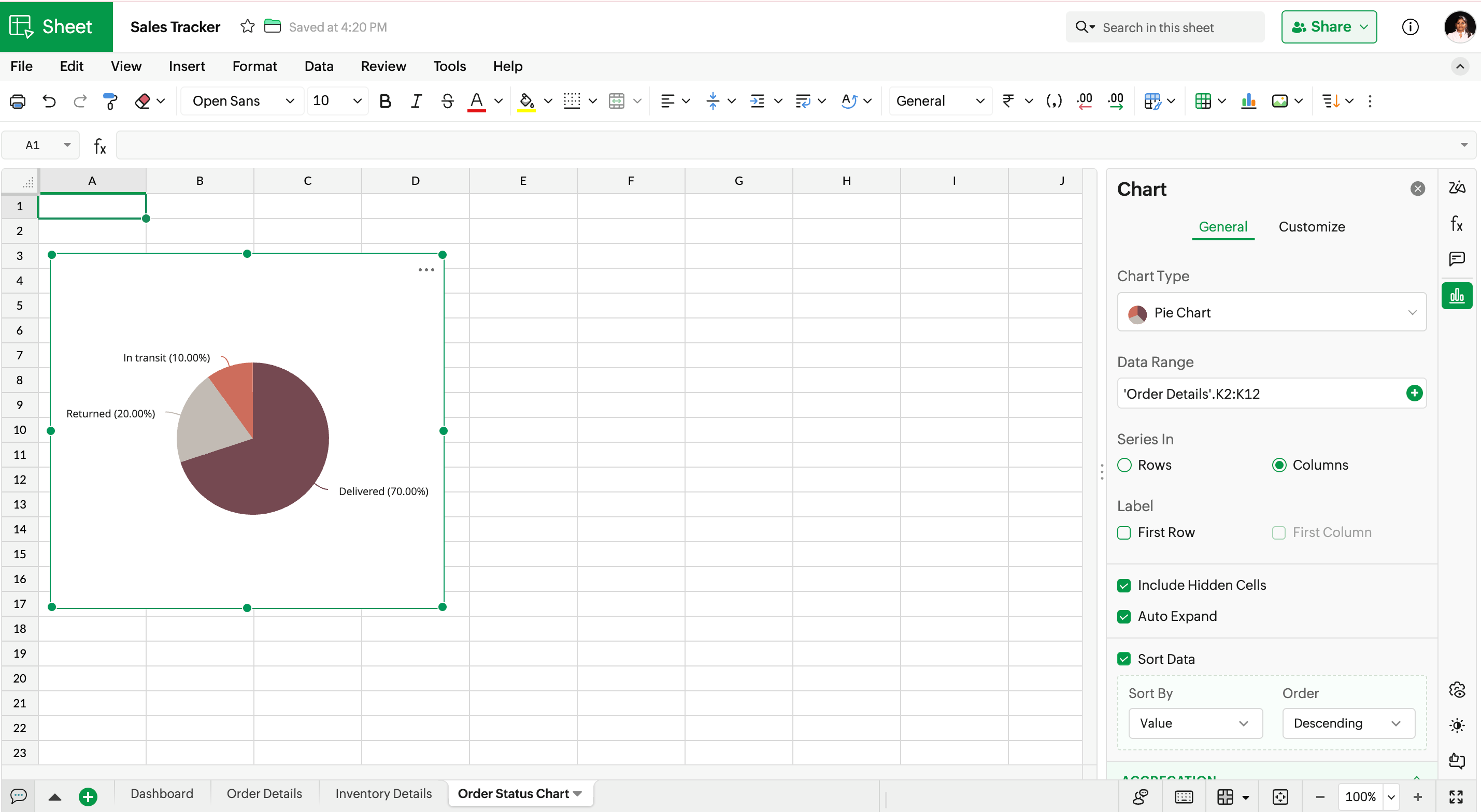 Whether you want to use the free online sales tracker template, customize it, or create a new one, Zoho Sheet gives you the flexibility to track your orders the way that works best for you.
