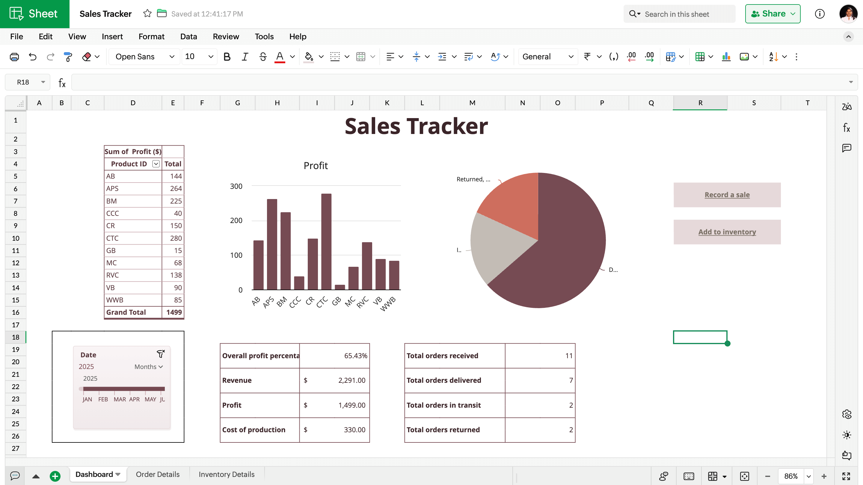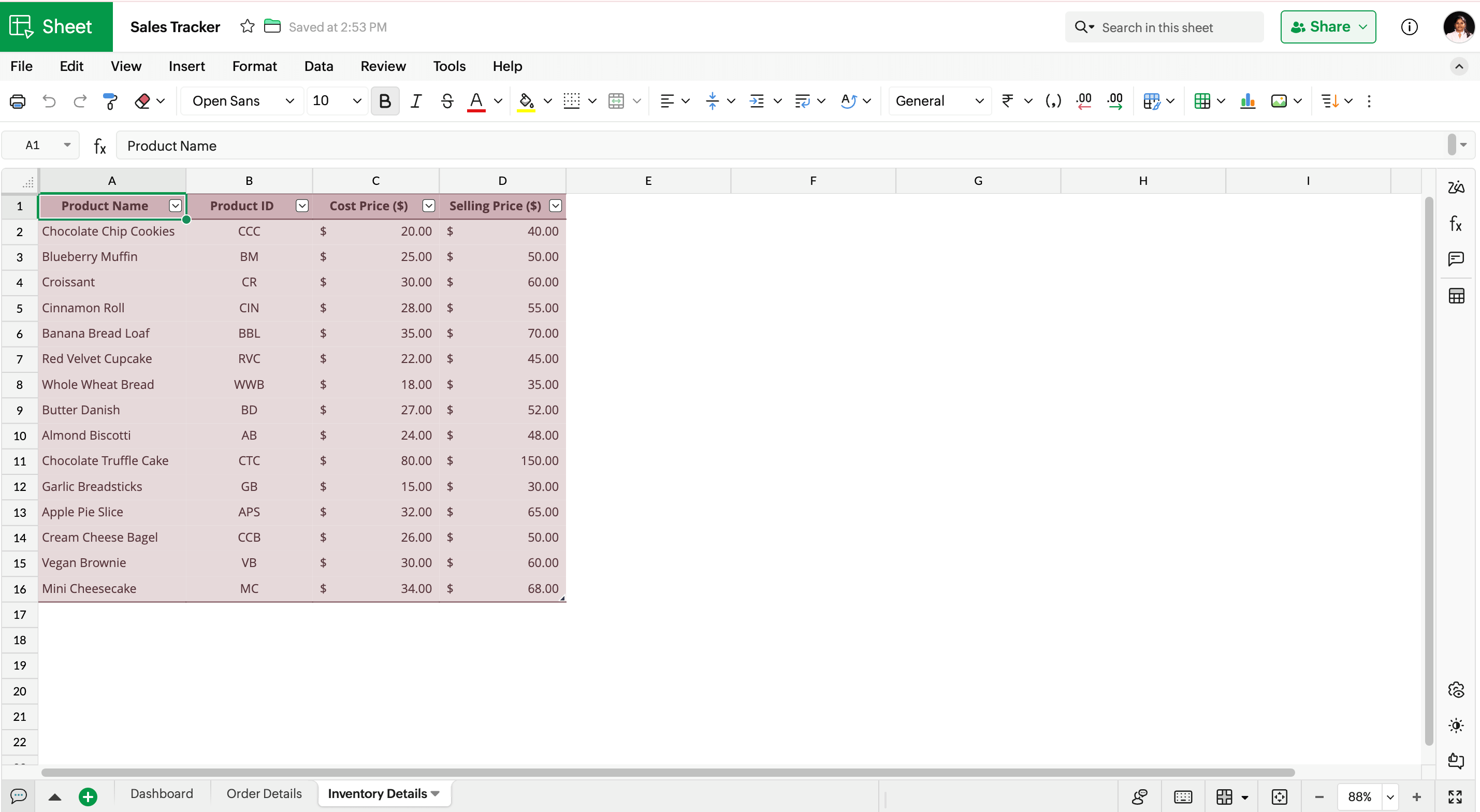 - Inventory details: In the inventory sheet, I added all my product details and availability, which keeps my team in sync with what's needed and what's available.