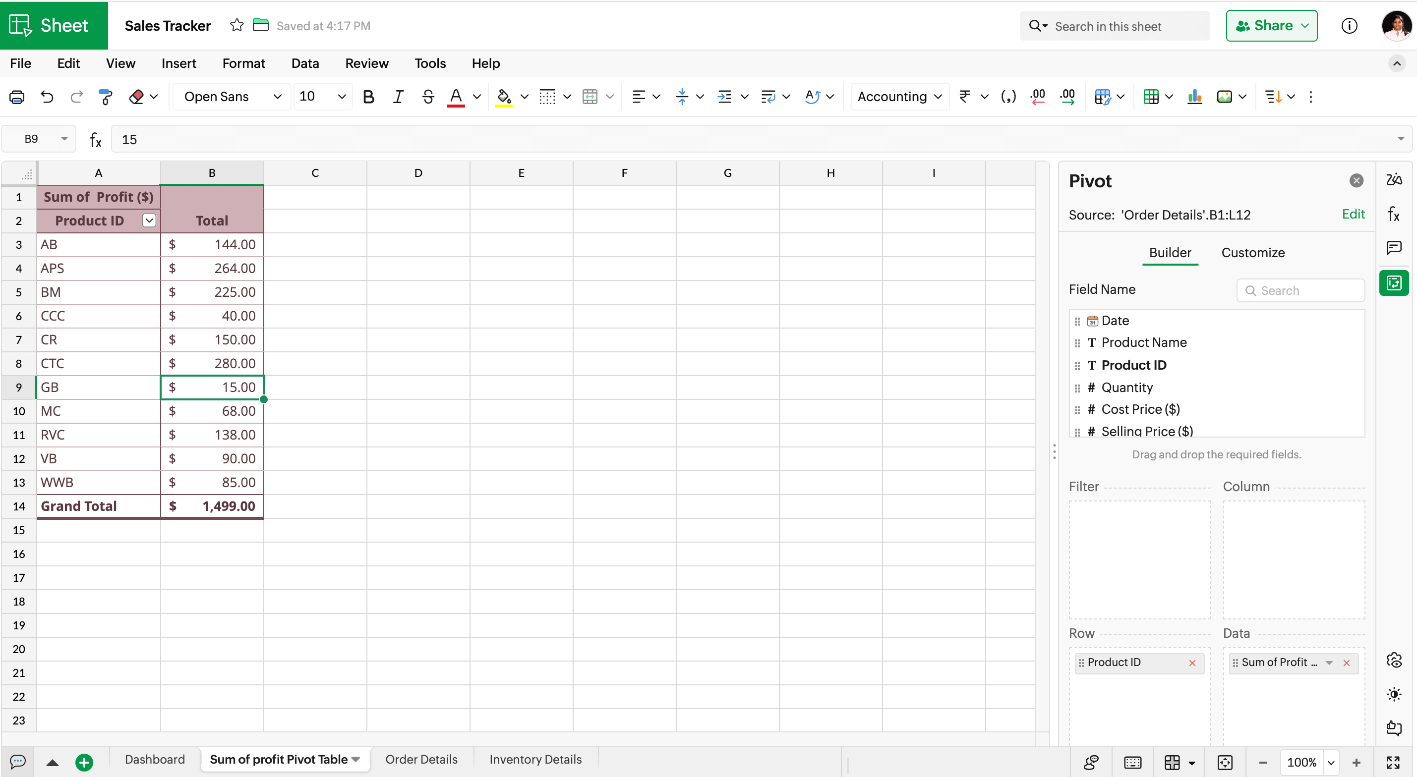 To make things easier, I pulled Product ID, Cost of Production, Selling prices from the Inventory sheet using the VLOOKUP function.