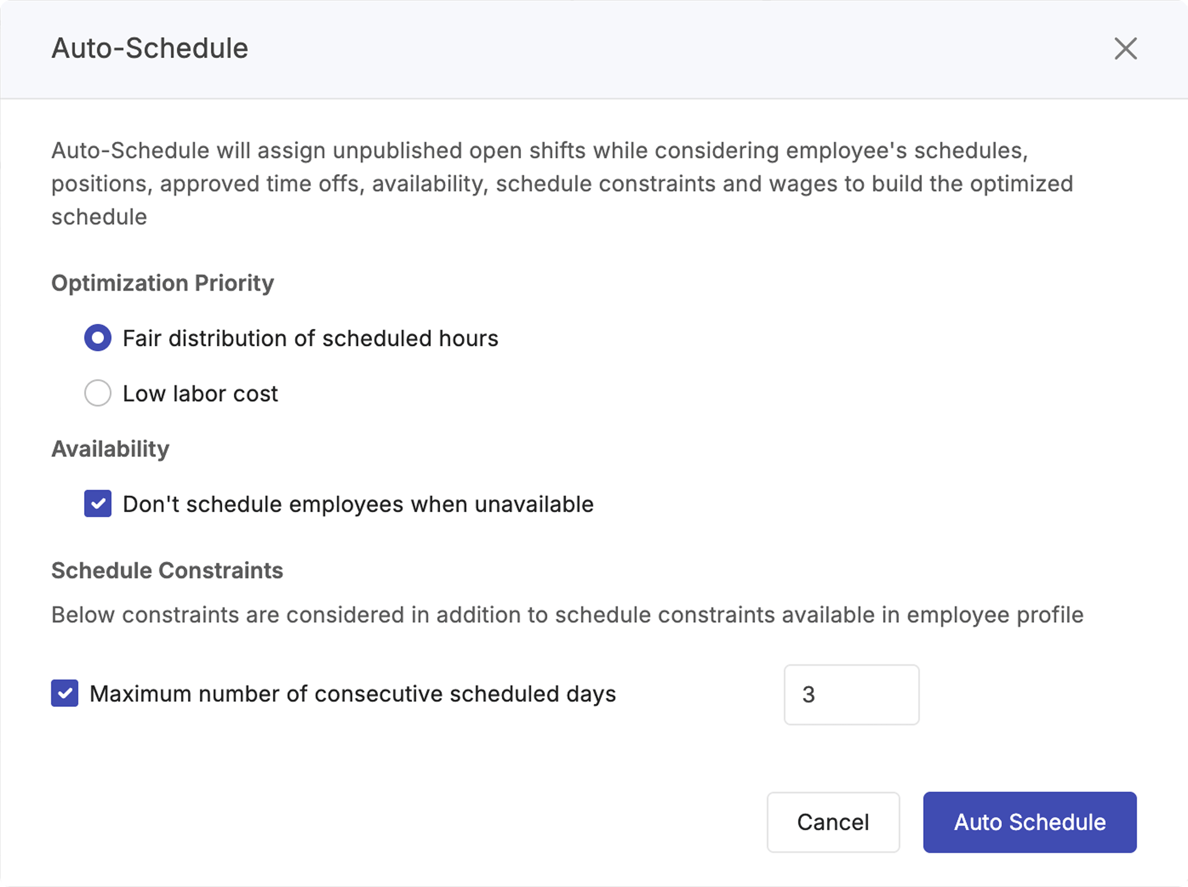 FeaturesAutomatically assign all unpublished open shifts to employees in just a few minutes. The auto-schedule runs based on employee roles, availability, and the set optimization priority (fairness or labor cost). This saves you time when scheduling work hours for large teams with many open shifts.
