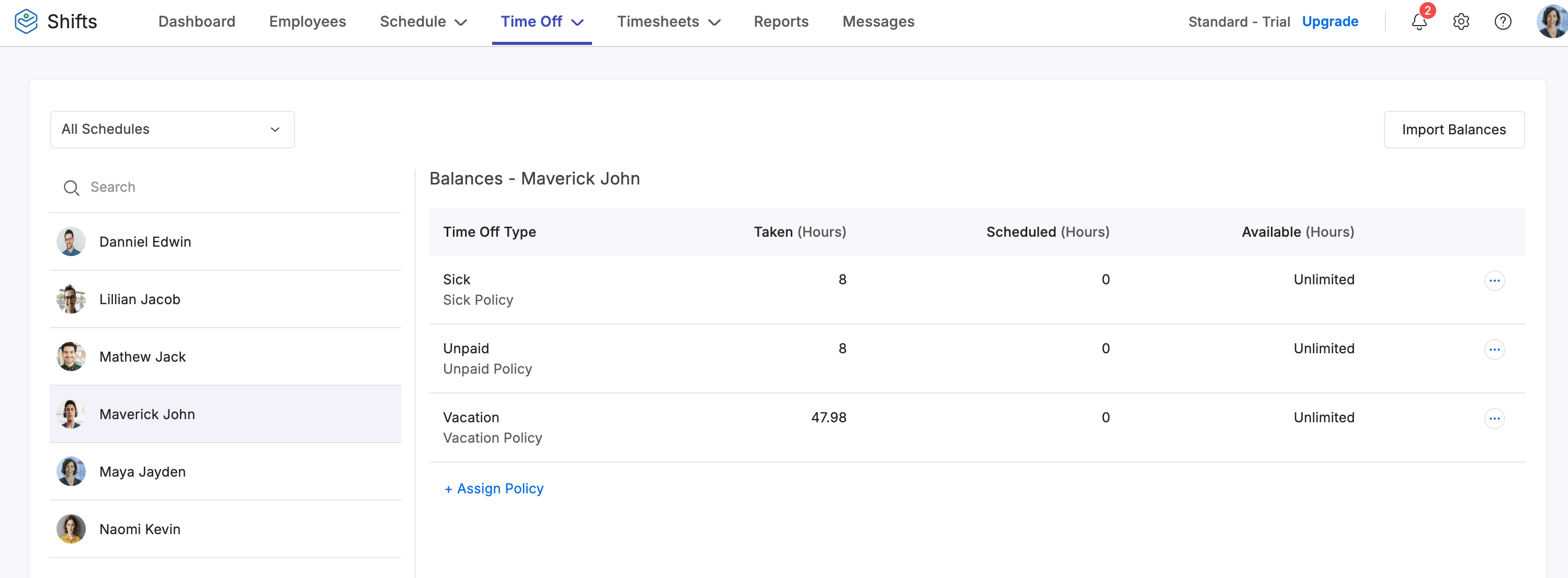 Admins can now view an employee's total leave accrual under the Balances tab in the Time Off menu. Get a consolidated view of the employee's PTO use, scheduled hours, and available hours for future time off requests. You can also see time off balances when submitting, editing, or approving time off requests.