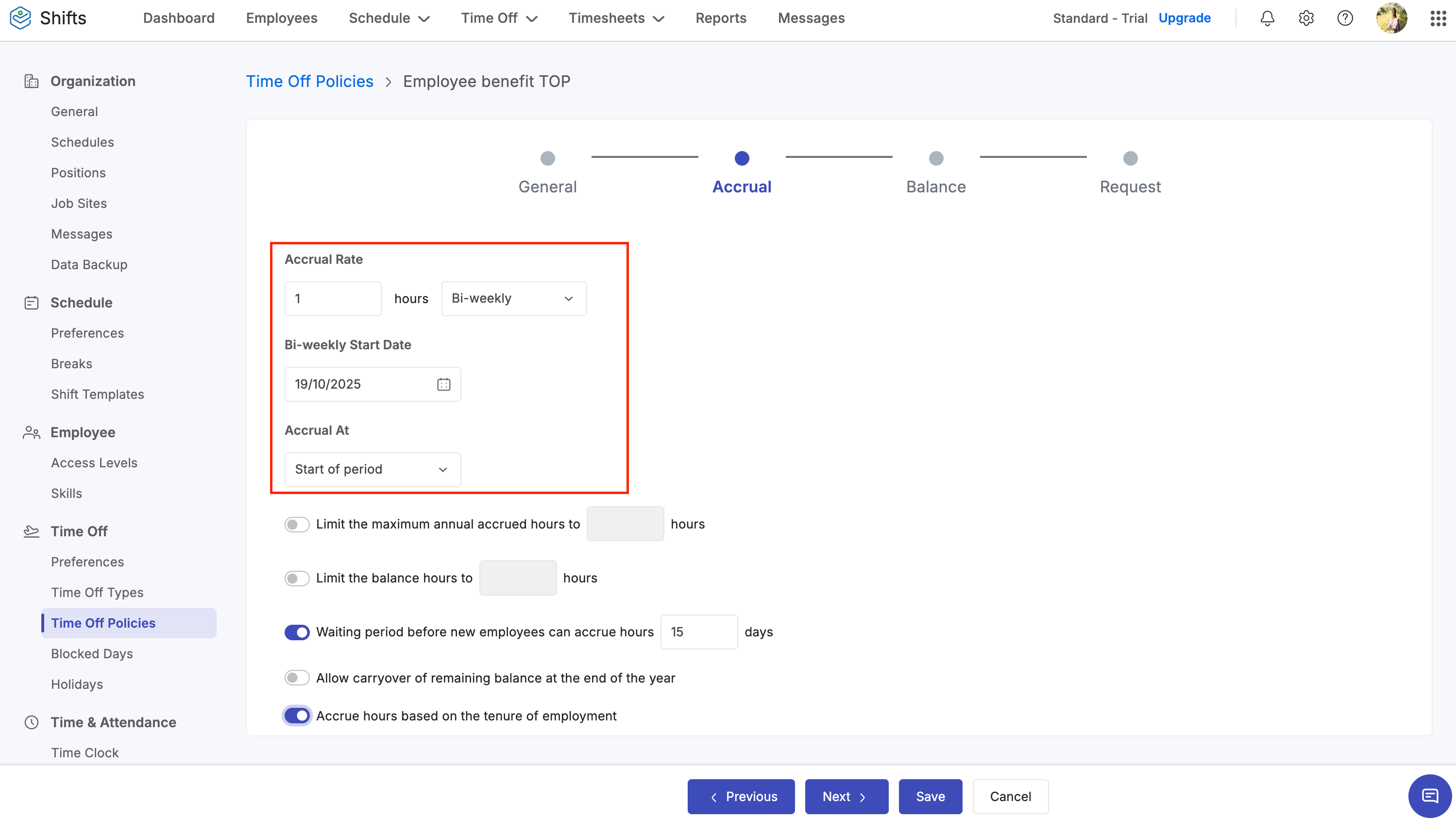 EnhancementsYou now have the option to configure bi-weekly accrual periods when setting up a fixed time off policy, and choose whether employees accrue leave at the start or end of each period.